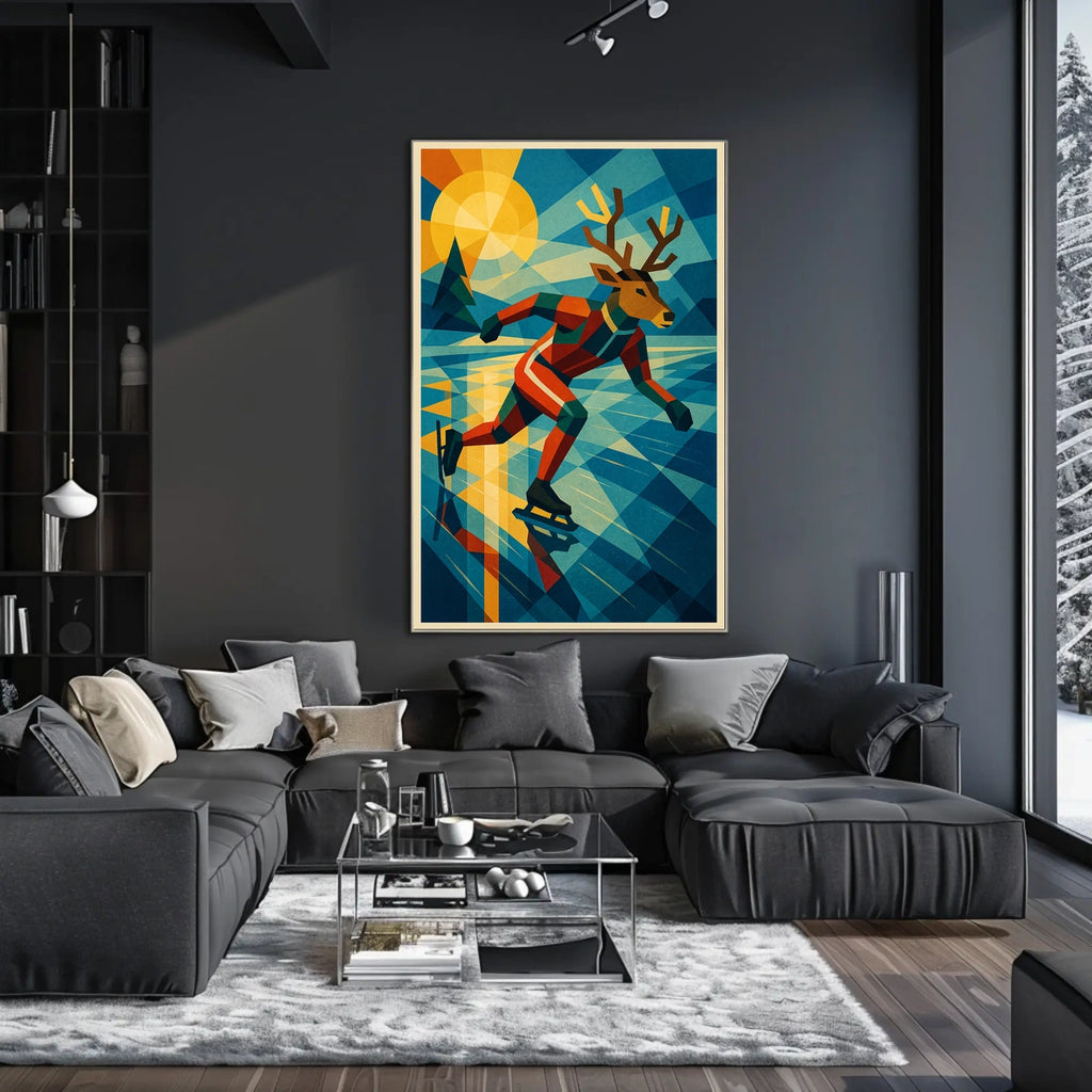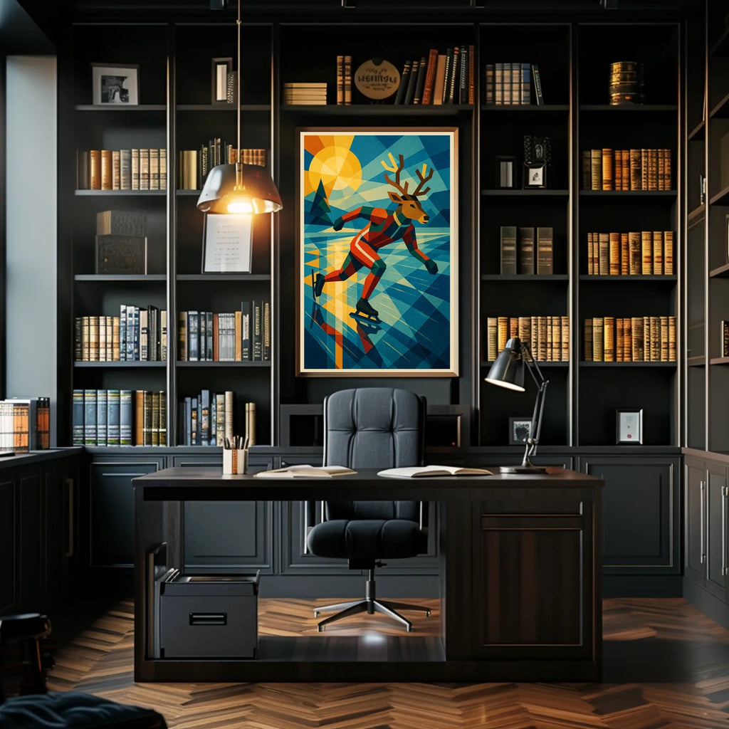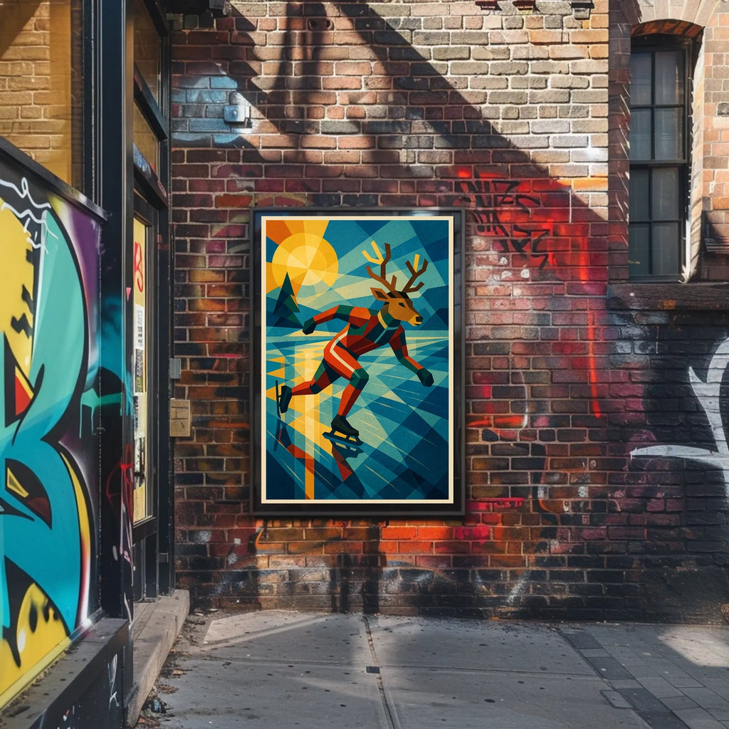 Dashing Deer on Ice: Abstract Sports Poster celebrates the beauty of wildlife and movement in a bold, geometric style. This captivating poster features a deer adorned in vibrant attire, gracefully speed skating across an icy landscape. Set against a winter backdrop illuminated by a stylized sun, the scene blends surrealism with modern design for a striking wall art piece that sparks imagination.