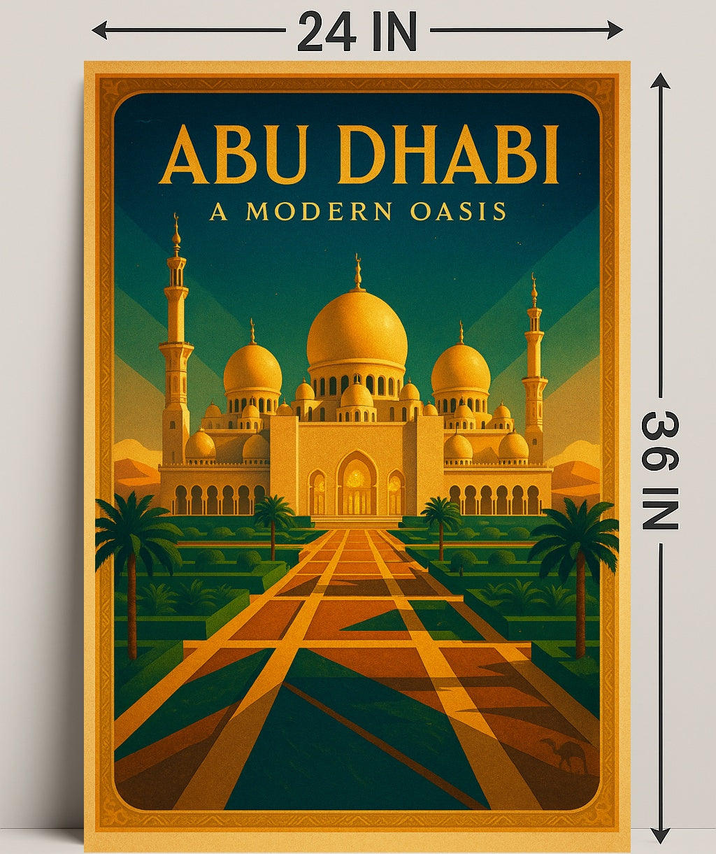 Abu Dhabi Oasis Elegance Vintage Travel Poster by PosterGoat brings the warmth and grandeur of Islamic architecture into your home with a refined Art Deco twist. This poster captures a sunlit palace of domes and minarets set against clear desert skies, framed by palm-lined gardens and geometric walkways — a striking focal point for living rooms, offices, or gallery walls.