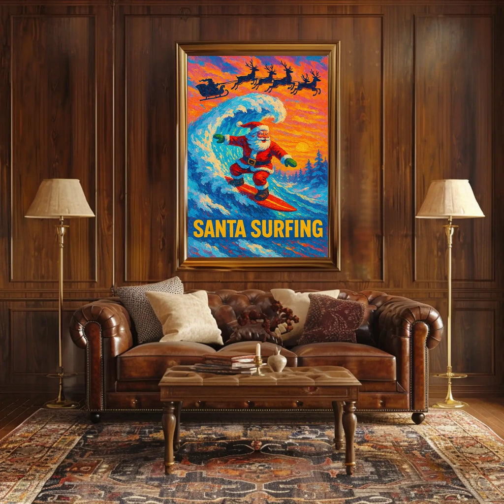 - Detailed design featuring Santa riding a massive ocean wave on a striking red surfboard, silhouetted against a festive sunset