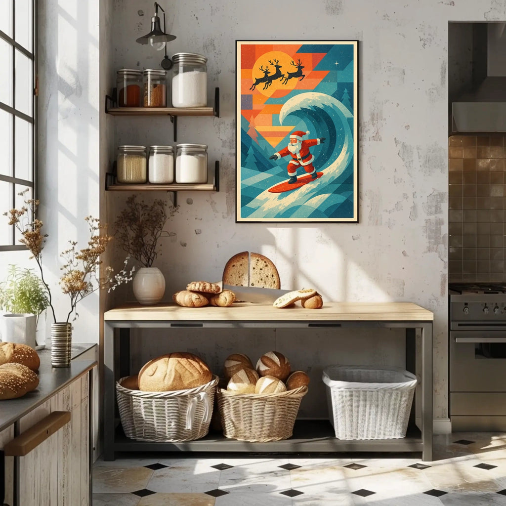 Celebrate the whimsy of Santa Surfing Retro Holiday Adventure Poster with this timeless wall art. Dive into a playful world where holiday cheer meets summertime fun, capturing Santa’s adventurous spirit and festive appeal in a single, vibrant piece. Santa, in his iconic red and white attire, rides a striking red surfboard beneath a trio of silhouetted reindeer against a glowing orange sun or moon.