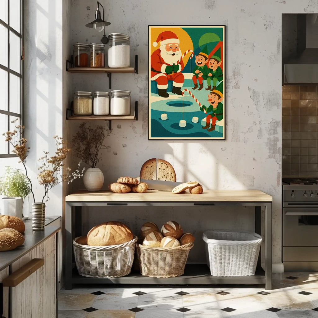 Immerse yourself in the festive spirit with this enchanting poster, capturing a delightful Christmas scene at the North Pole. The vintage, cartoonish style with bold, flat colors and simplified shapes evokes nostalgic charm, making it a playful and whimsical addition to your holiday decor. Santa, three cheerful elves, a candy cane fishing rod, and an icy hole come together in a heartwarming moment that celebrates Christmas joy.