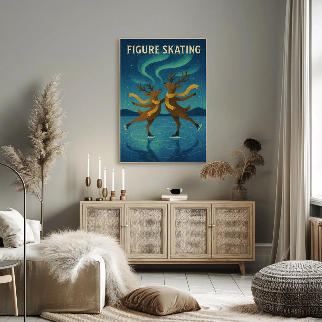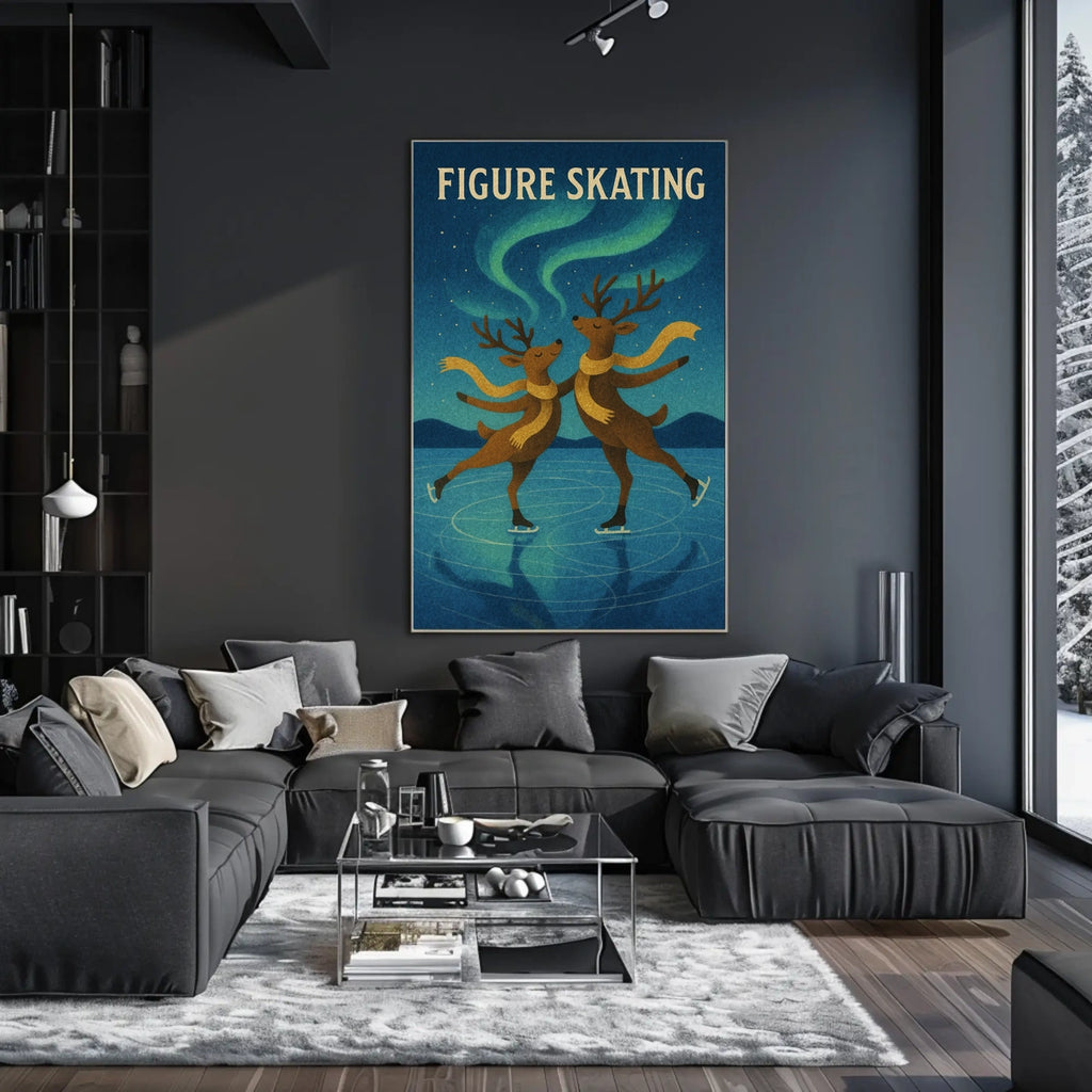 Celebrate the magic of winter with the Whimsical Reindeer Skating Adventure Animal Poster. This delightful piece captures two reindeer gracefully figure skating across a serene ice-covered landscape, their golden scarves gleaming under a starry sky illuminated by the Northern Lights. The art blends earthy tones with cool blues and greens, creating an illustrated scene that radiates warmth, camaraderie, and the natural beauty of the season.