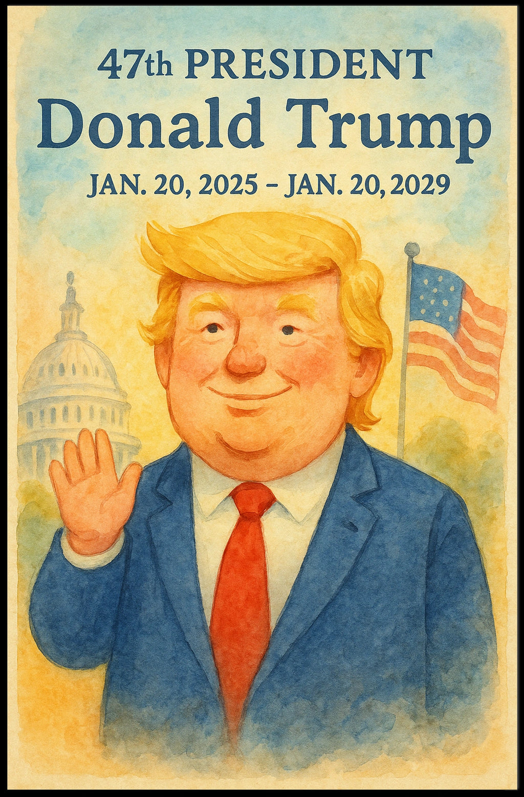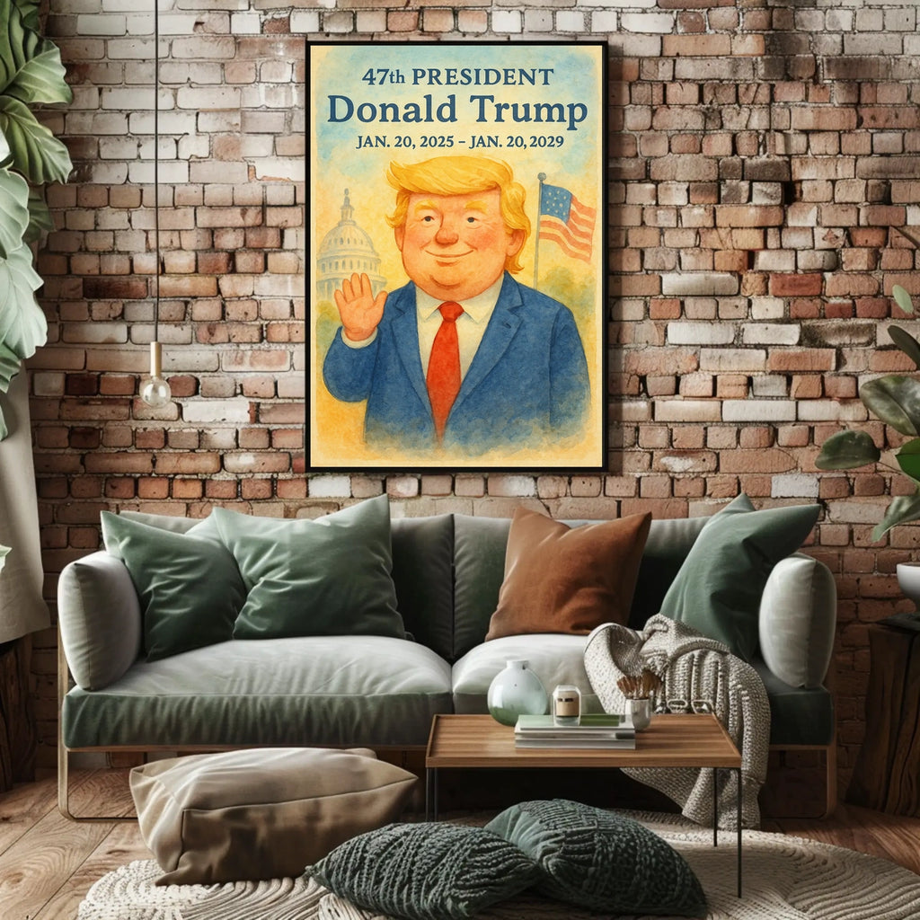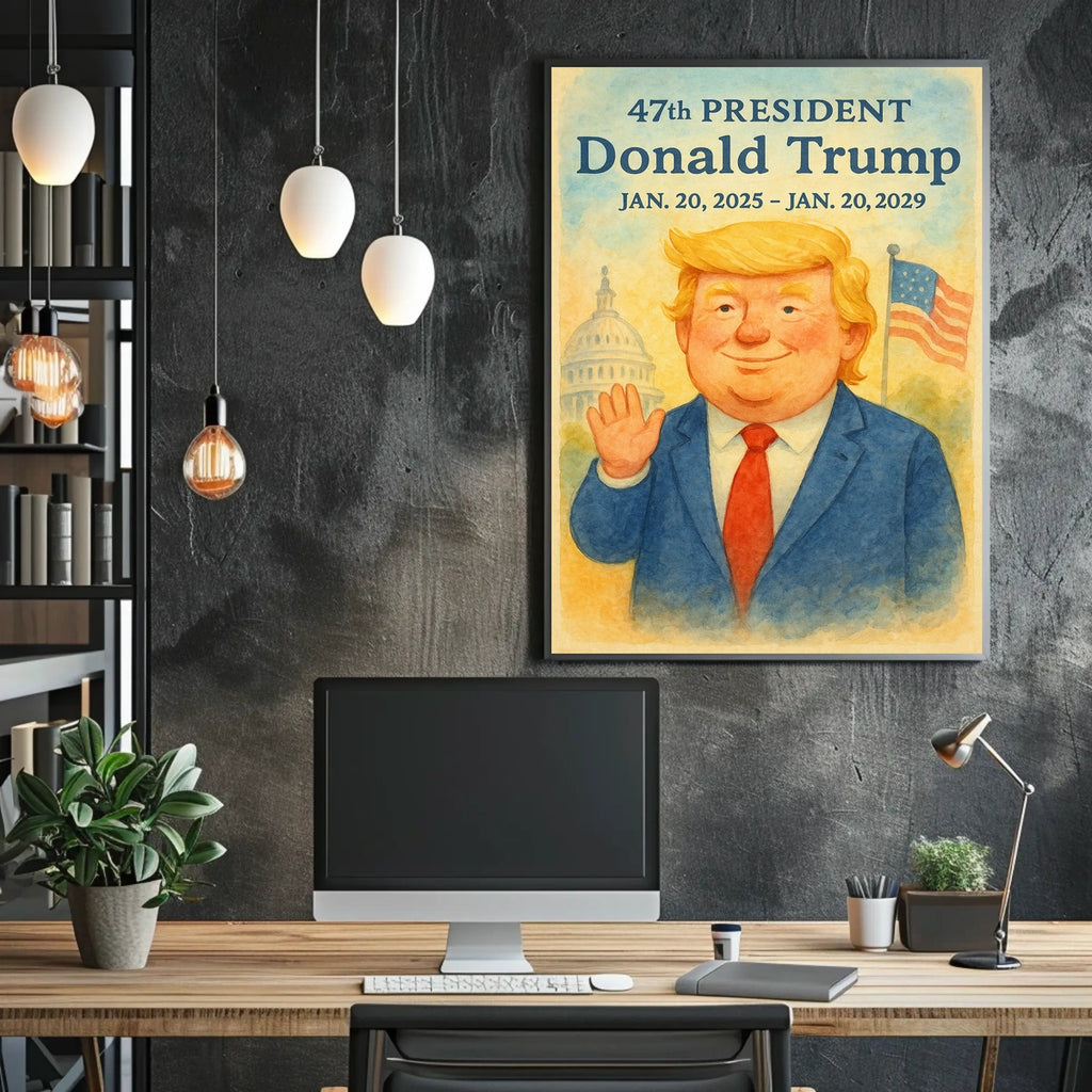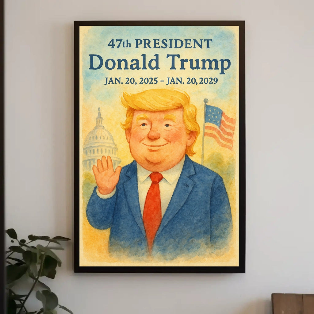In this evocative art print, President Donald Trump stands confidently, waving with an infectious optimism, against the backdrop of the iconic Capitol dome and a gently unfurling American flag. The whimsical watercolor technique imbues the scene with a dreamy quality, blending soft colors and flowing lines to create an atmosphere of hope and renewal. This poster captures a symbolic moment of leadership, embodying the spirit of new beginnings for the nation. Whether you admire the artistry or the subject, this piece is a beacon of positivity perfect for collectors and enthusiasts alike.