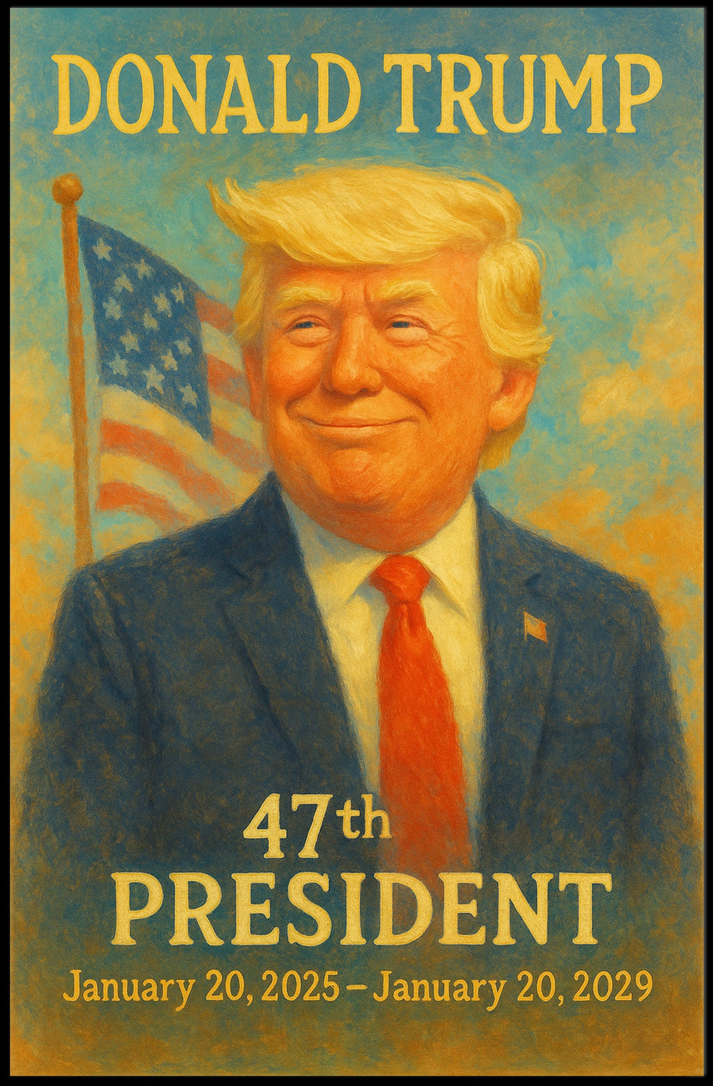 This arresting art print portrays President Donald Trump radiating confidence and determination. His warm, assured smile is underscored by an impeccably tailored suit and tie, highlighting his commanding presence. The backdrop features a flowing American flag against a vibrant, painterly sky, creating a tableau that underscores the themes of patriotism and dynamic leadership.