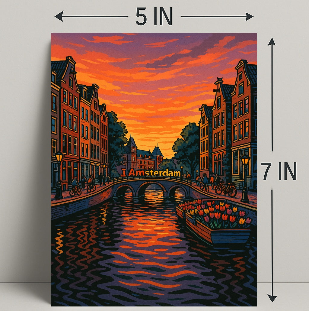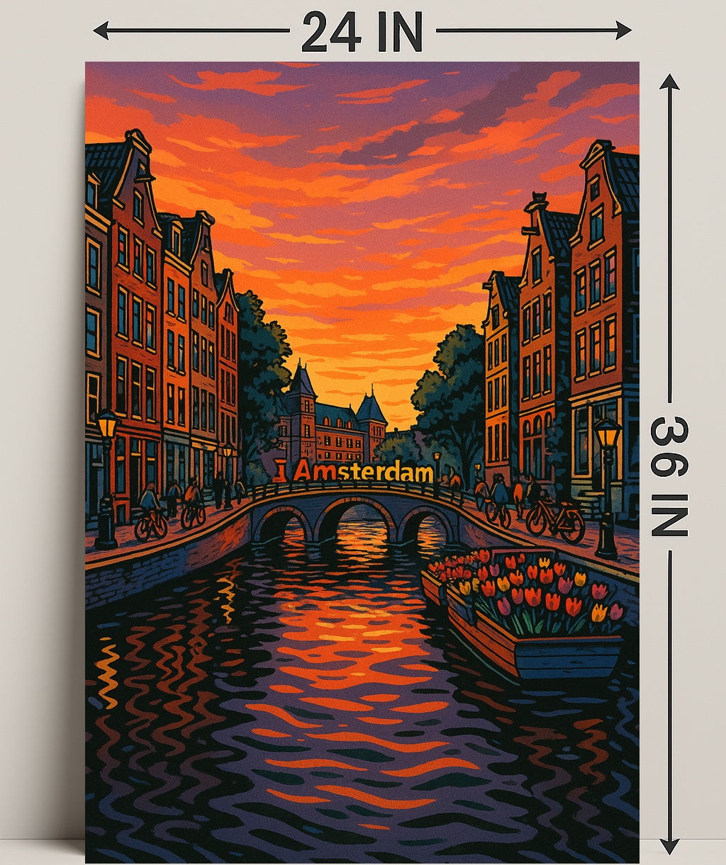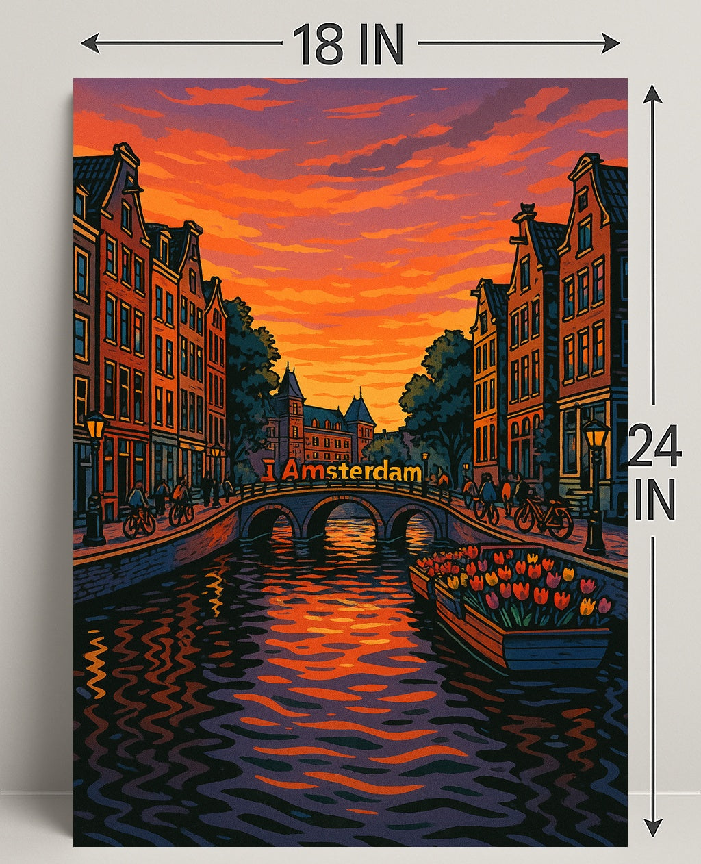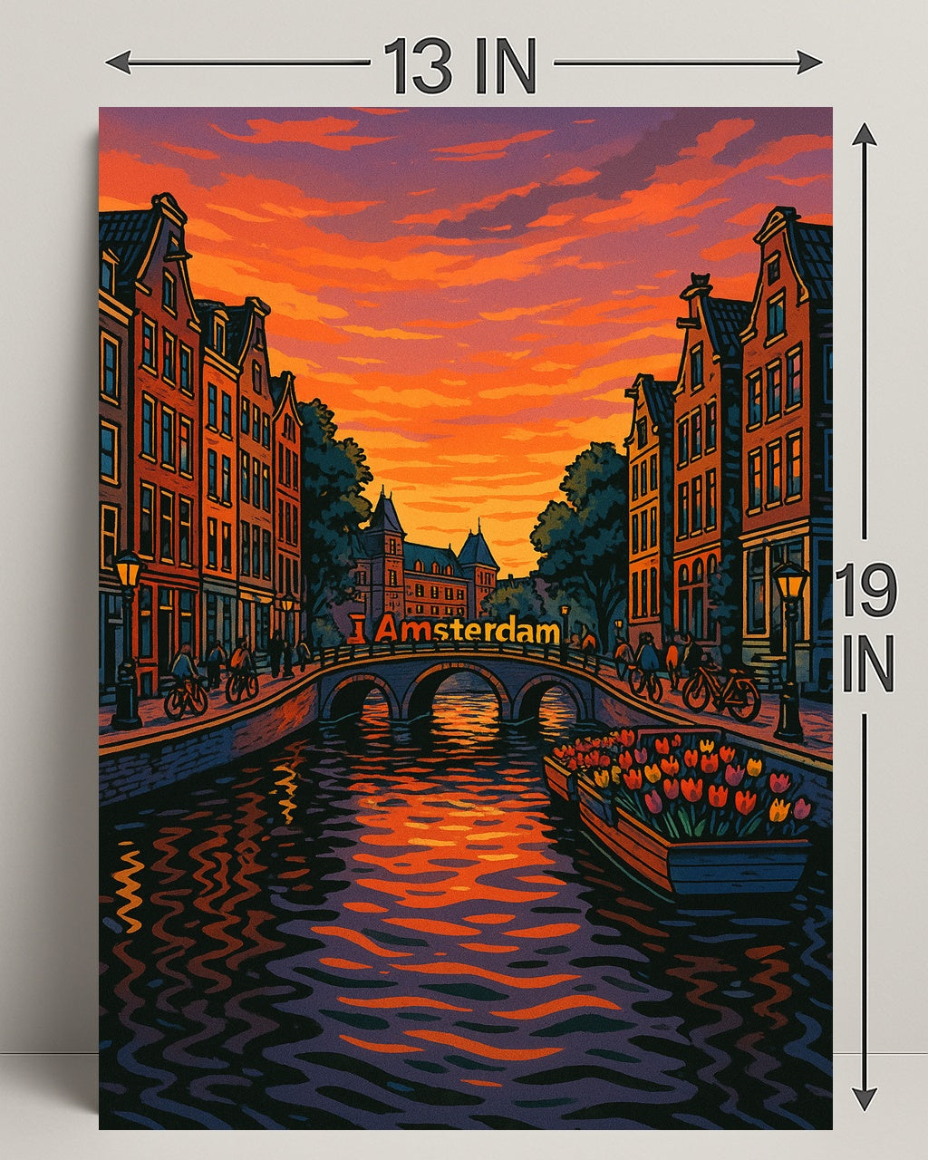 Stunning Visuals: The rich hues of sunset illuminate the iconic Amsterdam canals, creating a mesmerizing focal point in your home.