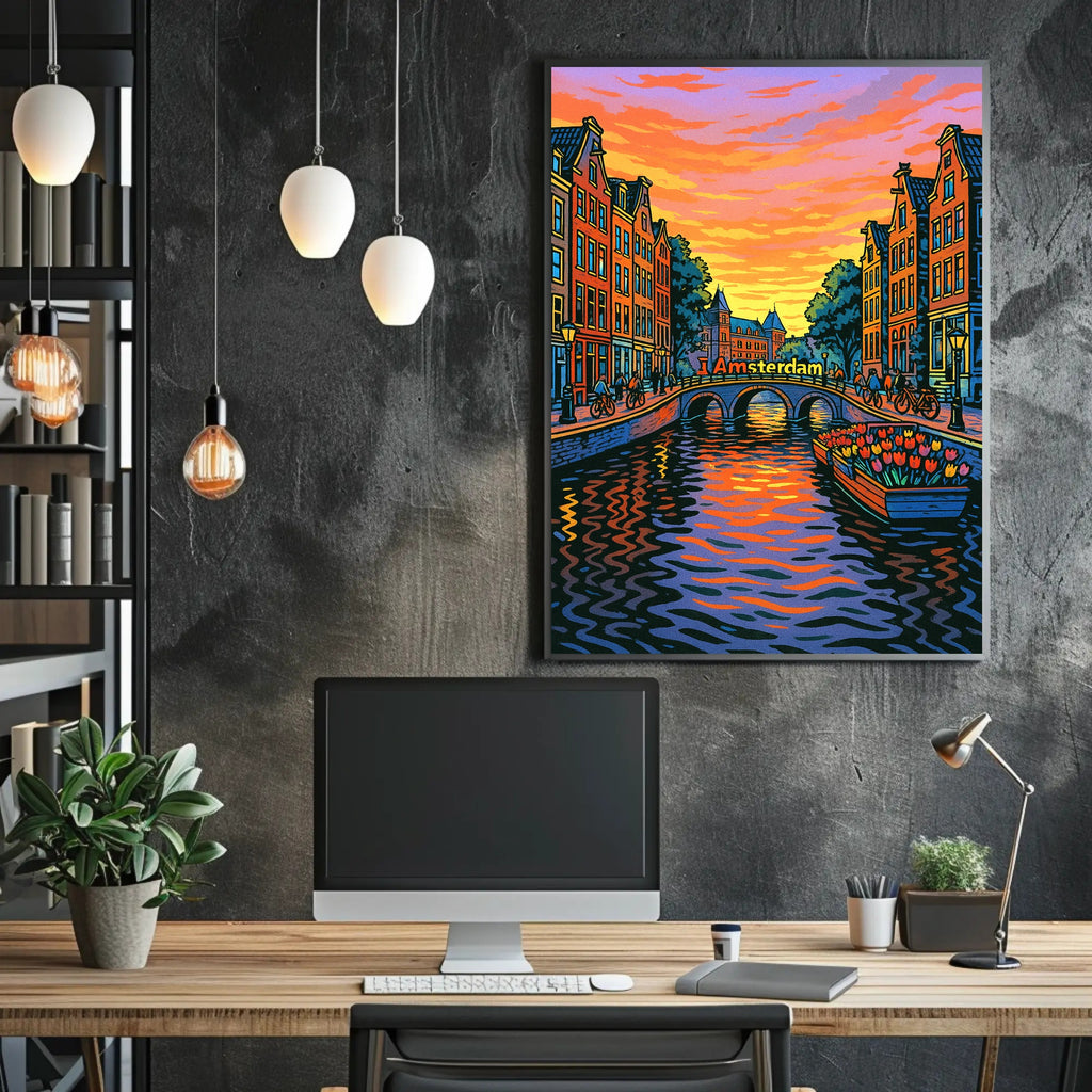 Bring the magic of golden-hour Amsterdam into your home with the Amsterdam at Sunset Poster from PosterGoat. This vibrant travel poster captures a canal-side scene at dusk—arched bridges, classic gabled houses, bicycles along the quay and a boat of tulips—all reflected in rippling water under a dramatic orange and purple sky. The illustration's bold colors and crisp lines create a striking focal point that livens living rooms, entryways, offices, or gallery walls.