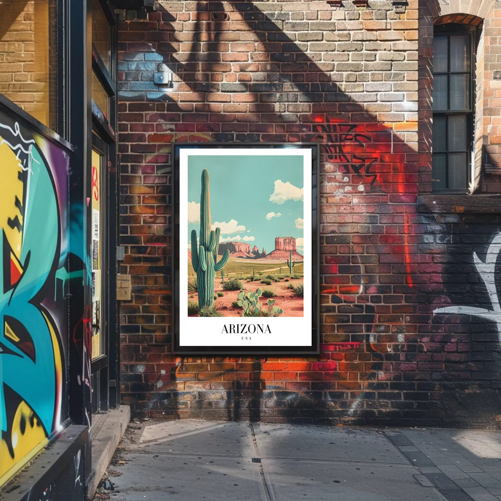 Experience the allure of Arizona's landscapes with this stunning travel poster that captures the timeless beauty of the Southwest. The design portrays a classic desert scene with majestic saguaro cacti and iconic red rock formations reminiscent of Monument Valley. The sky's clear, vibrant blue with scattered clouds highlights Arizona's sunny climate, while the vintage mid-20th-century travel poster style adds a nostalgic touch. Bold, flat colors and stylized illustrations bring the natural elements to life, evoking a sense of adventure and wanderlust. Perfect for adding a touch of vintage charm to any space and celebrating the splendor of the American desert.