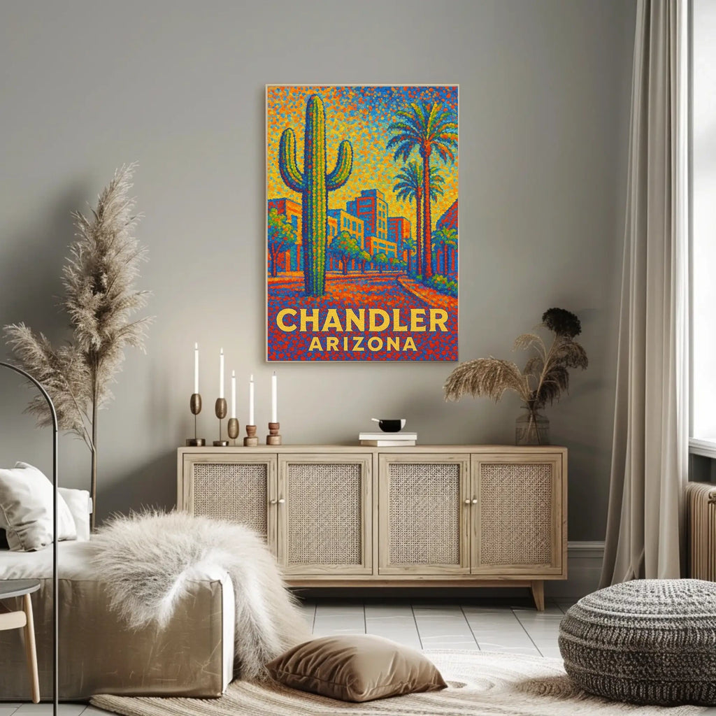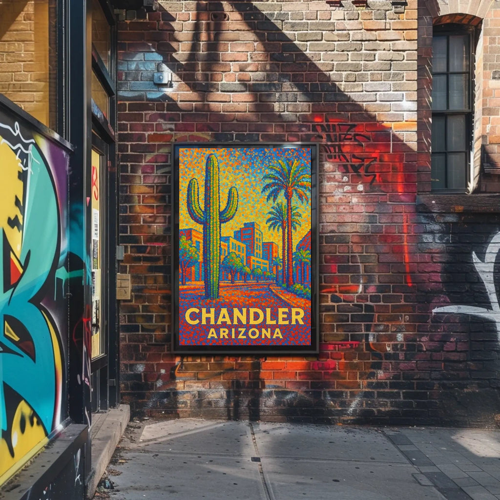 Printed with precision and made to inspire, this artwork is more than decoration—it’s a conversation piece that connects nature, culture, and modern city life. Boldly displaying "CHANDLER ARIZONA," it makes an eye-catching addition to any space, bringing warmth and color to your decor. Bring Chandler Arizona Pointillist Cityscape Art Poster into your home, classroom, or office today and let your walls tell a powerful story.