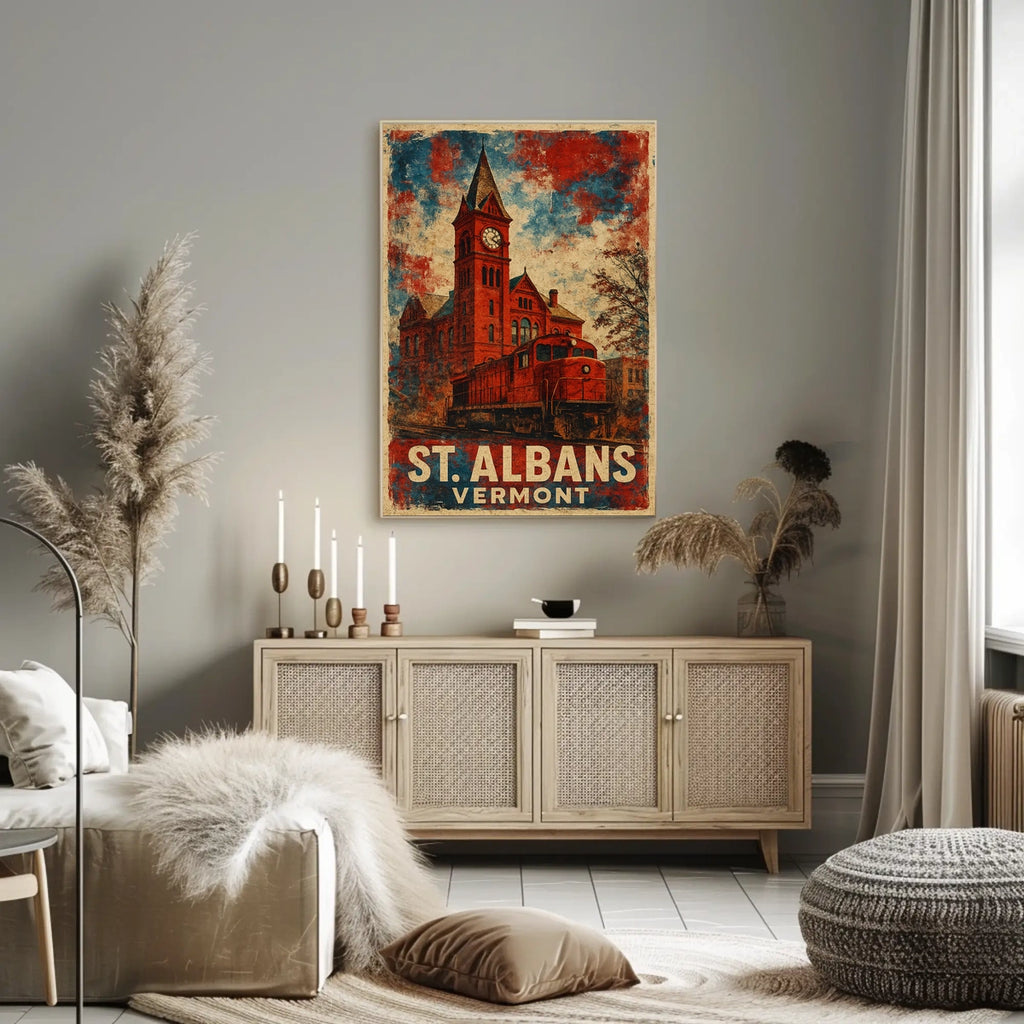 Experience the charm of early 20th-century America with this vintage poster featuring St. Albans, Vermont. The artwork highlights a striking red-hued clock tower building, a symbol of the town's architectural heritage, set against a classic train in the foreground. The textured background of red, blue, and beige tones enhances its retro appeal, reminiscent of iconic travel posters. This piece captures a patriotic and historical mood, celebrating the community's railway significance and architectural beauty. Perfect for history enthusiasts and art lovers, it adds a nostalgic touch to any space.