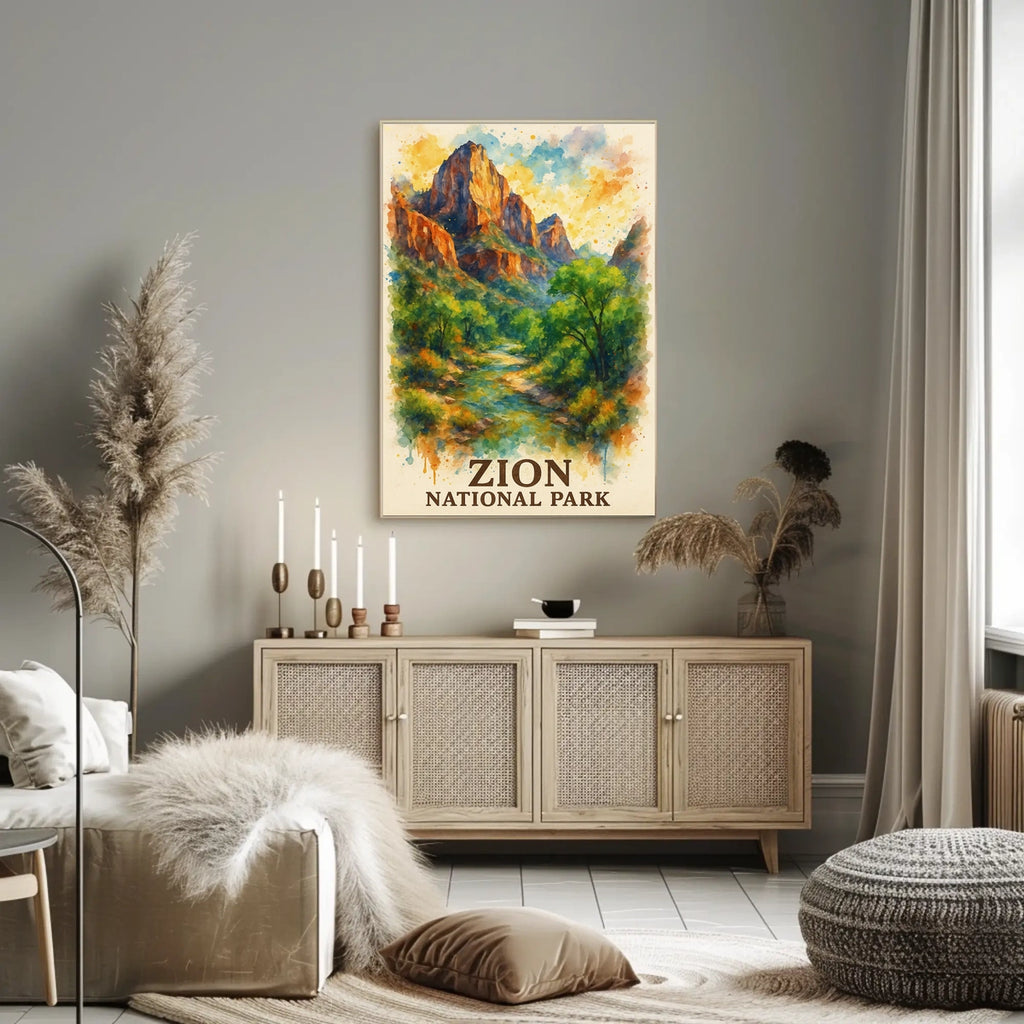 Zion National Park Watercolor Landscape Art Poster invites you to celebrate the breathtaking beauty of Zion National Park. This piece is designed to capture its unique appeal and is perfect for collectors, enthusiasts, or anyone who wants to bring meaning and inspiration into their space. This Zion art print blends watercolor landscape aesthetics, making it a superb choice for nature art lovers and national park art collectors alike.