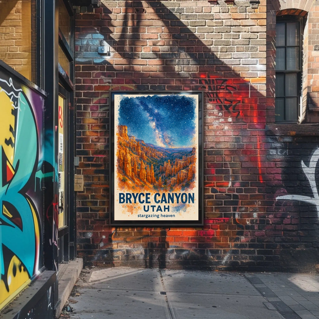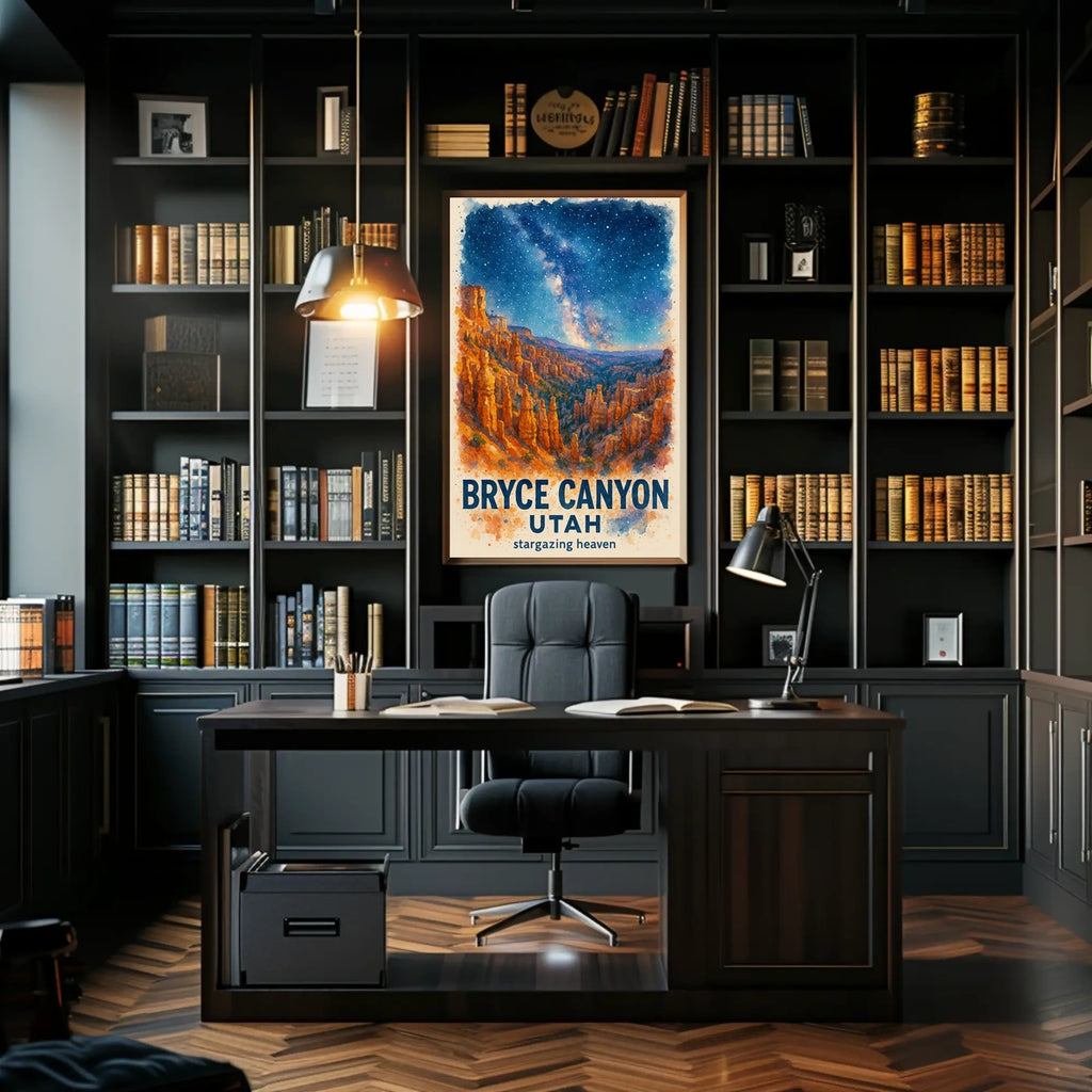 Perfect for fans of astronomy art, Bryce Canyon poster, celestial beauty, hoodoos print, Milky Way print, natural wonders, nature wall art, night sky art, peaceful wall decor, photorealistic poster, serene night scene, stargazing decor, travel inspiration, Utah landscapes, and watercolor landscape.