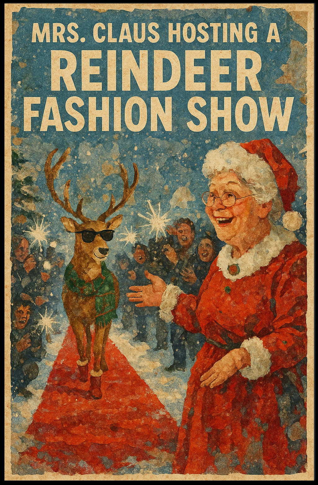 Mrs. Claus Reindeer Fashion Show Vintage Artistic Poster celebrates the whimsy of winter with a delightful poster that captures a vintage scene of festive cheer. Mrs. Claus takes center stage, orchestrating an eccentric reindeer fashion show amidst a snowy holiday setting. With its painterly texture, the illustration nods to classic holiday art, exuding nostalgia and charm. The portrayal of a stylish reindeer donning sunglasses and a green scarf on a red carpet adds humor and a sense of lighthearted festivity. This playful and vibrant poster makes the perfect decorative piece for any Christmas or winter-themed event, celebrating the spirit of the season.