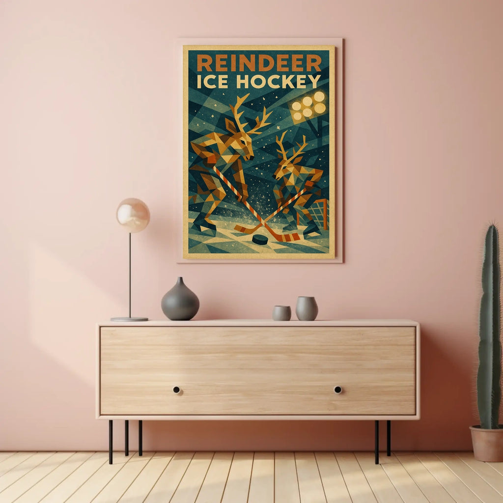 Immerse yourself in the playful and imaginative world of "Reindeer Ice Hockey" with this captivating poster. Featuring two stylized reindeer engaged in an exhilarating game on an icy rink, the scene bursts with energy under bright floodlights. This artistic depiction uses geometric shapes to create a dynamic sense of motion. Illustrated in a bold polygonal, abstract style, the reindeer and their equipment shine in a vintage palette of blues, browns, and oranges. This piece effortlessly combines the charm of wilderness with the excitement of sport, offering a unique, whimsical twist on traditional ice hockey.
