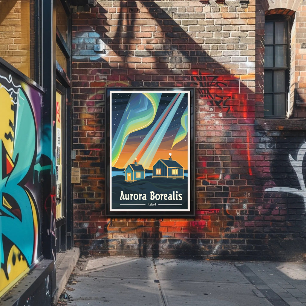 Capture the wonder of Iceland's night sky with the "Aurora Borealis Magic in Iceland Travel Poster" from PosterGoat — a striking, mid-century inspired print that transforms any room into a window on the Northern Lights. This illustrative travel poster features sweeping, colorful aurora ribbons and a starry sky above two warmly lit wooden cabins resting on a serene, snowy landscape, evoking a cozy winter retreat beneath nature's greatest light show.