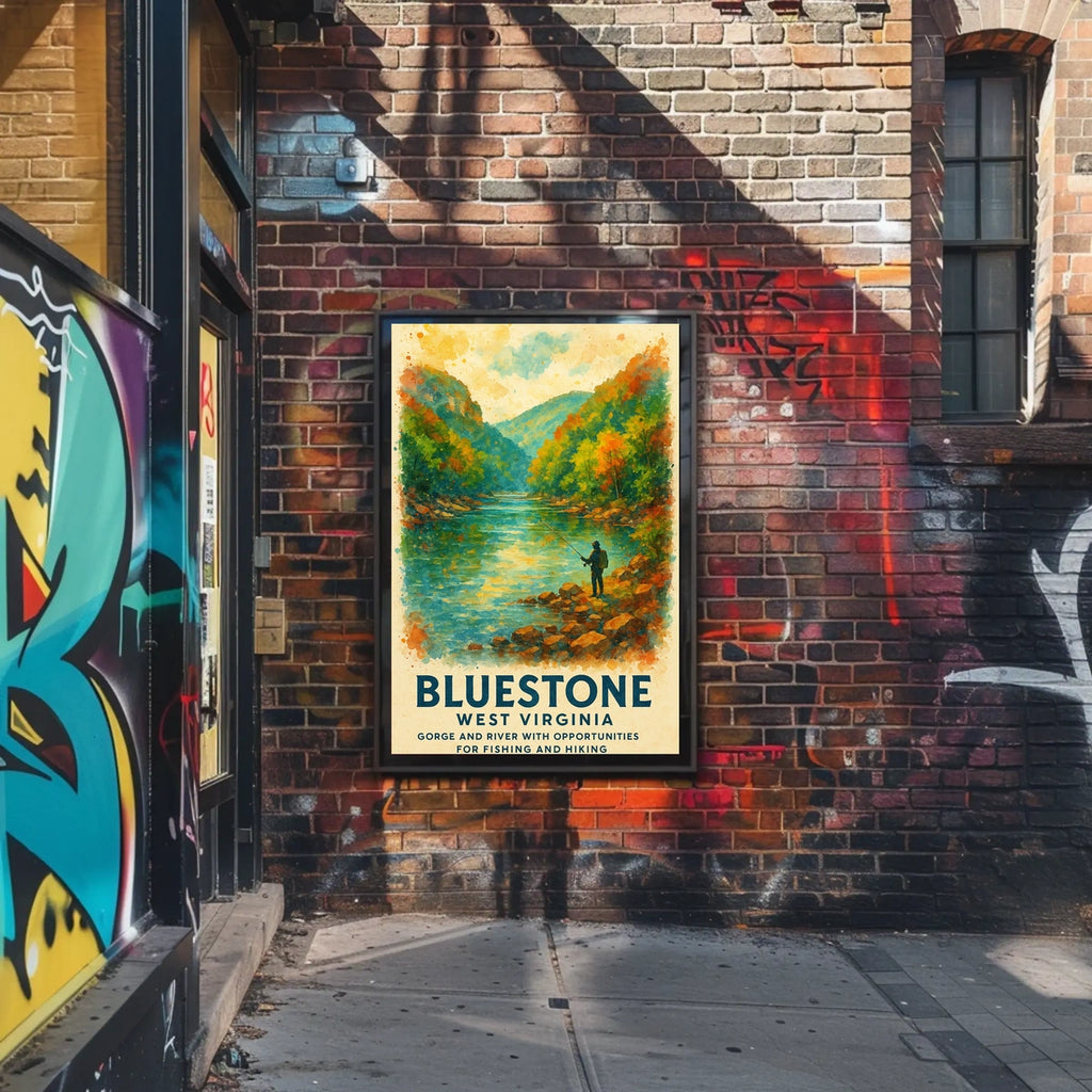 Immerse yourself in the tranquil beauty of Bluestone Gorge, West Virginia, with this captivating watercolor poster. Featuring a solitary figure fishing by a serene river, the artwork captures the essence of outdoor adventure amidst lush trees and vibrant autumn colors. The painterly style brings to life the peaceful allure of nature, inviting viewers to explore the picturesque gorge and river setting.