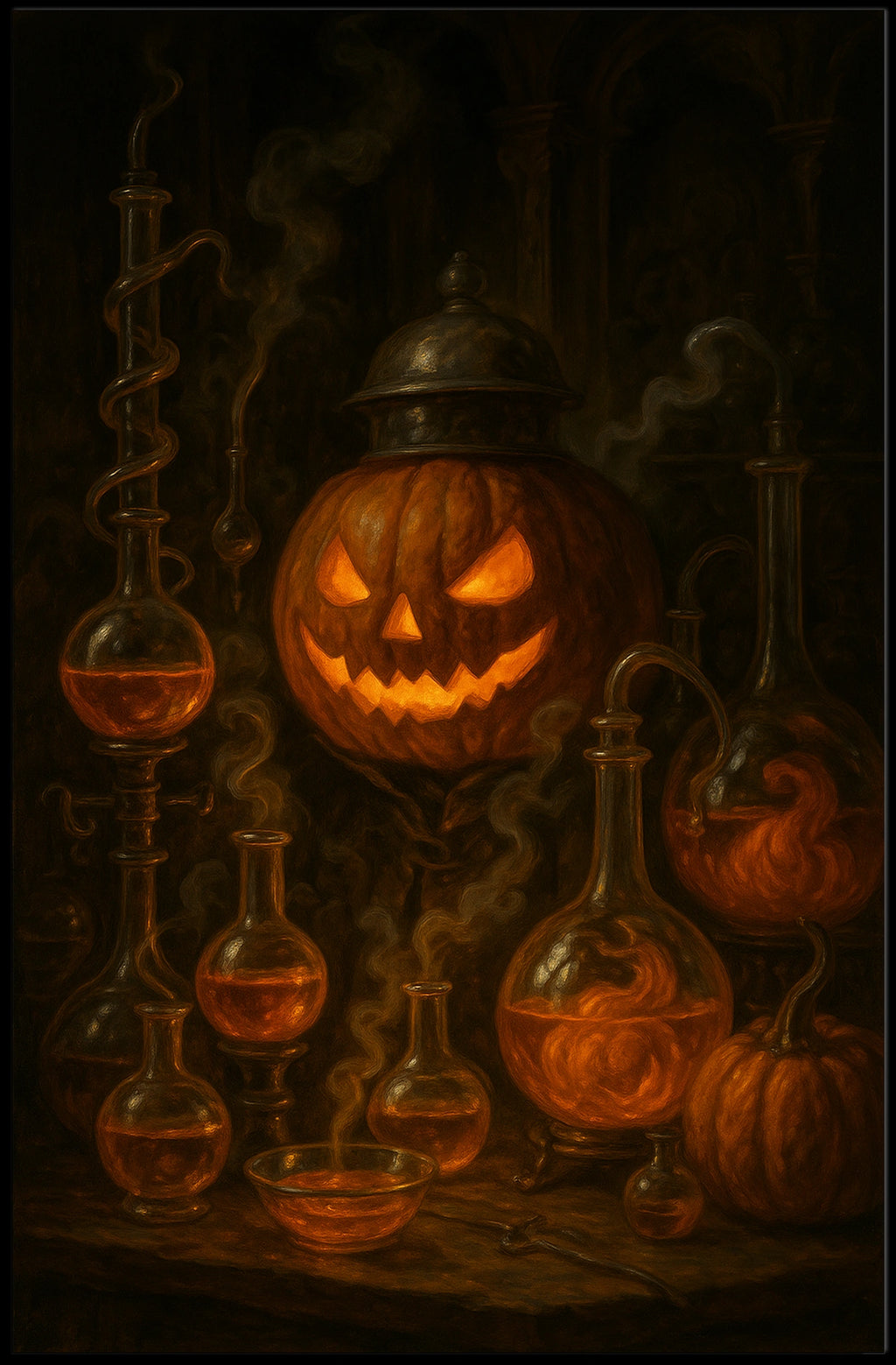 Transform your space with a scene that blends a mystical laboratory with autumnal charm. At the heart of the artwork is a menacing Jack-o’-lantern, its sinister grin warmed by candlelight. Surrounding it, steaming beakers and flasks evoke the magic of potion-making. The vintage style, rendered in rich oranges and browns, creates an eerie yet whimsical atmosphere—perfect for Halloween celebrations or adding a touch of mystery to any room. This alchemy illustration captures the allure of the mystical and the charm of autumn in a single striking poster.