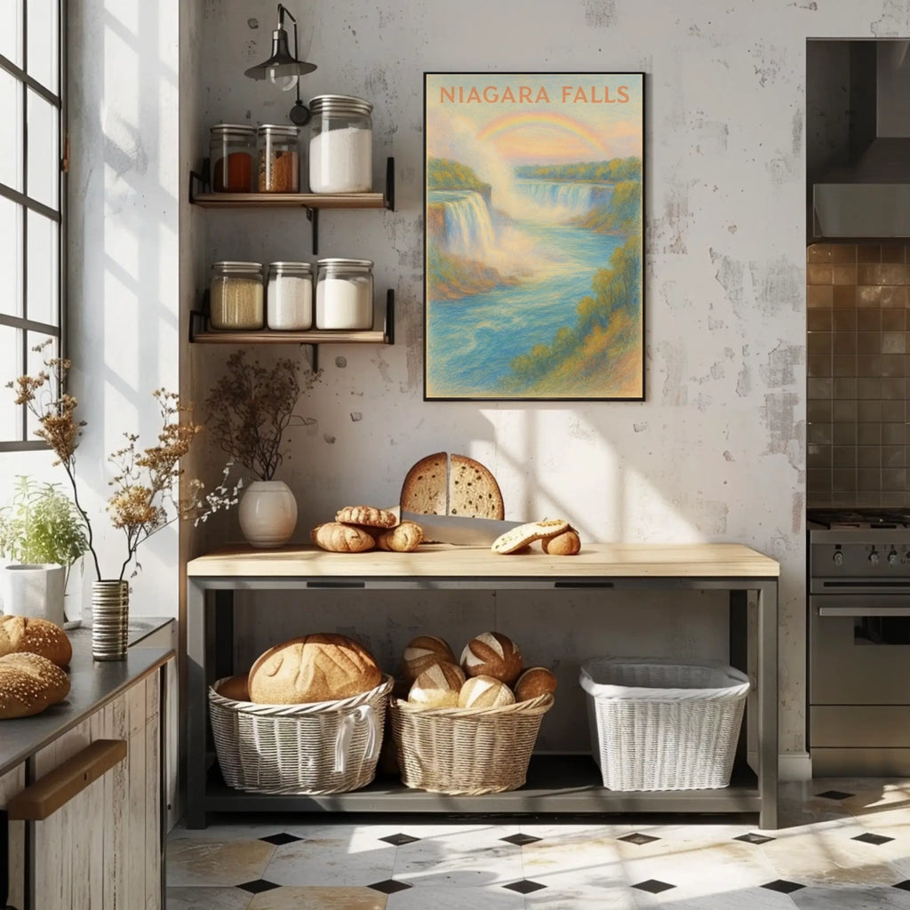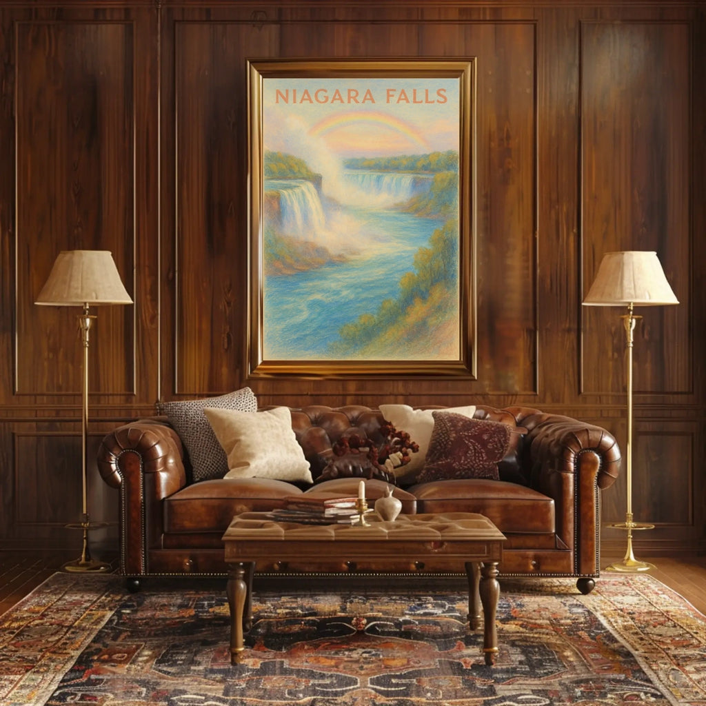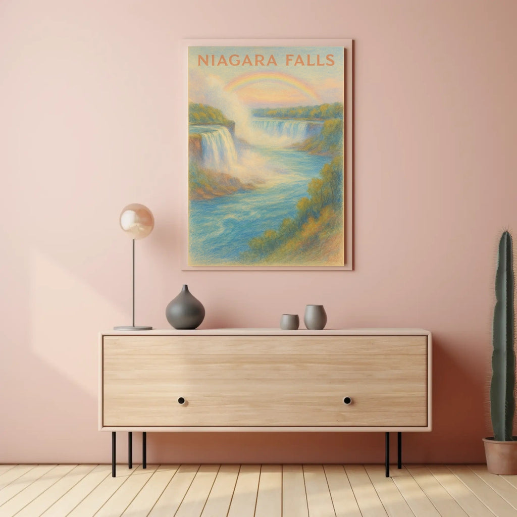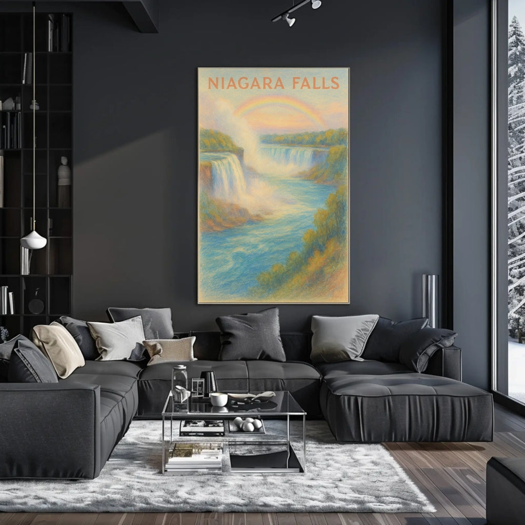Experience the serene majesty of the Niagara Falls Scenic Splendor Travel Poster with this breathtaking travel poster. Capturing the awe-inspiring force of cascading waterfalls, it is beautifully enhanced by a whimsical rainbow arching overhead. The lush foliage bordering the river complements the natural setting, evoking a sense of peace and tranquility. The artistic style blends vintage art with impressionistic flair, using soft pastel tones to emphasize light and atmosphere.