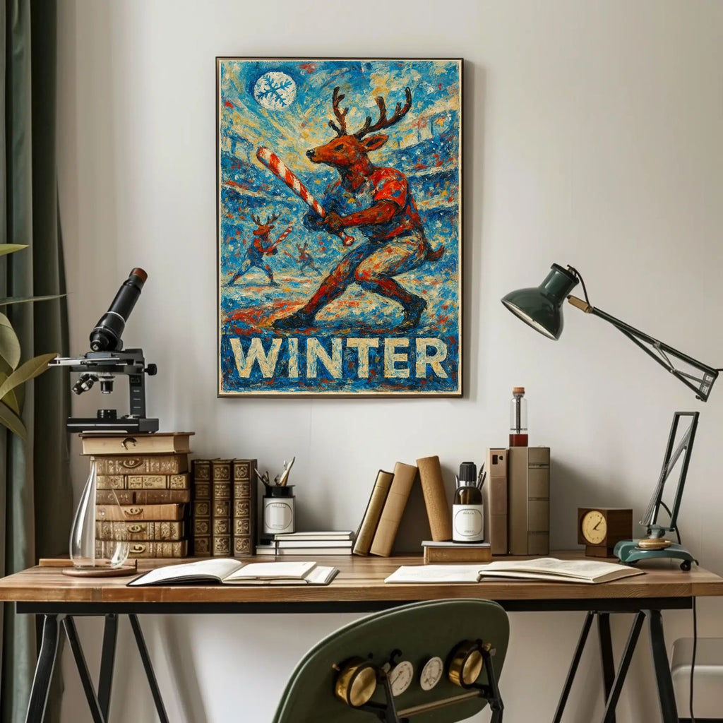 This imaginative poster captures the festive spirit with an anthropomorphic reindeer in a baseball uniform, ready to swing a candy cane bat. Set against a colorful stadium backdrop, the scene is painted with bold, impressionistic brushstrokes that bring the snow- and ice-themed environment to life. A large snowflake drifts across the sky, adding whimsy as the word “WINTER” stands out prominently at the bottom. A delightful blend of sports and holiday charm, this artwork is a lively addition to any festive decor or winter-themed collection.