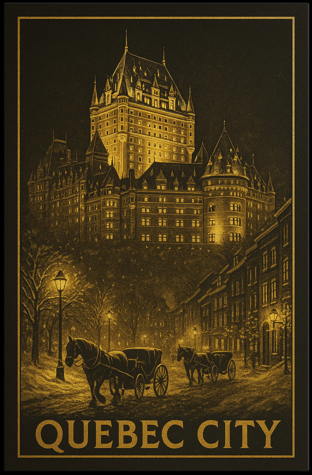- Detailed design highlighting the nighttime skyline and warm glow of Quebec City