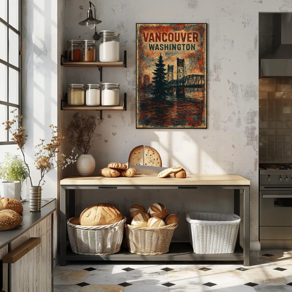 Inspired by mid-century tourism posters, this Vancouver, Washington art piece blends industrial charm with natural beauty. It’s ideal for fans of nostalgic wall decor and vintage travel posters, adding historical allure to homes, classrooms, or offices.