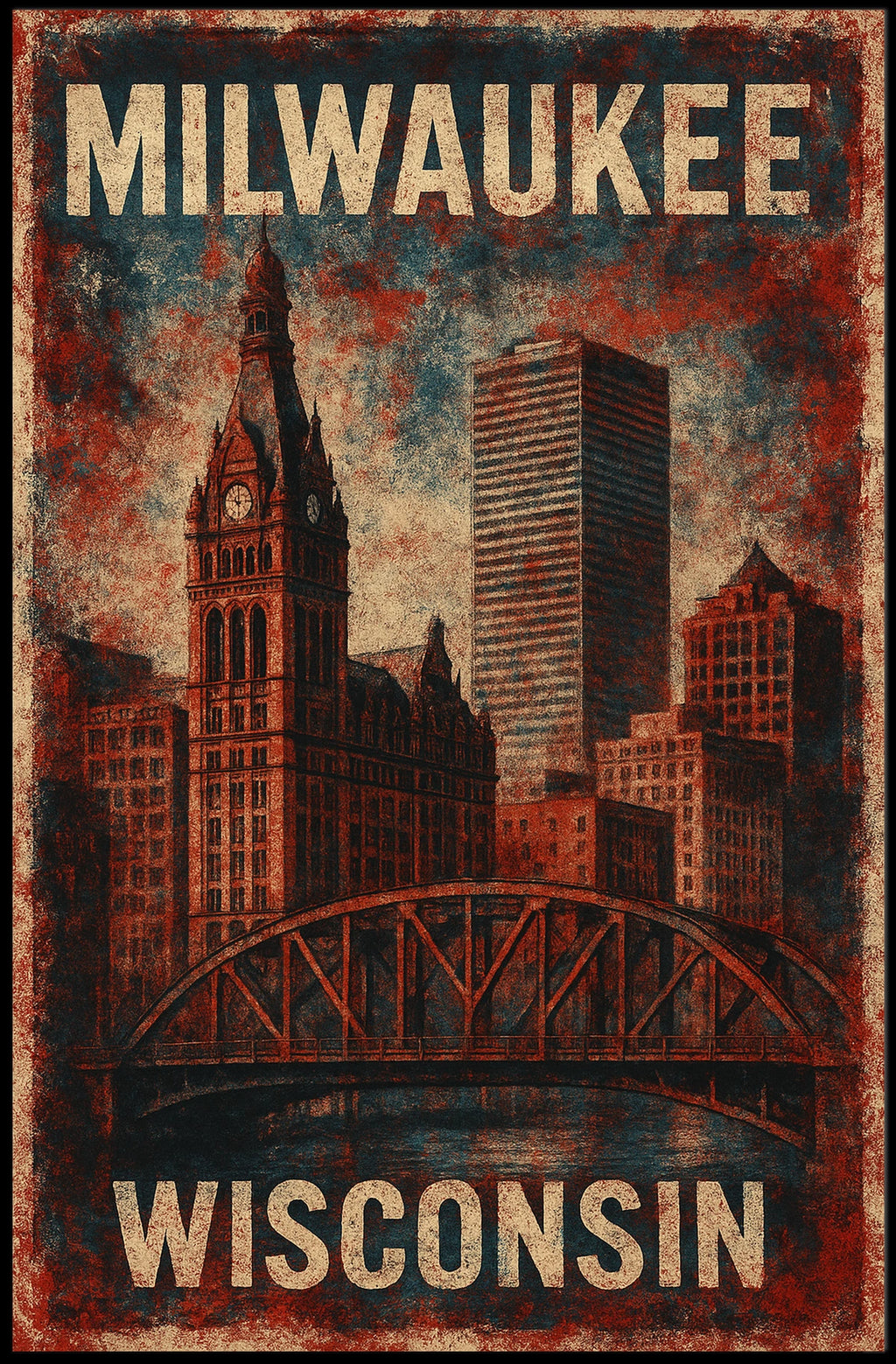 - Detailed design highlighting Milwaukee’s iconic skyline, riverfront landmarks, and vintage cityscape charm