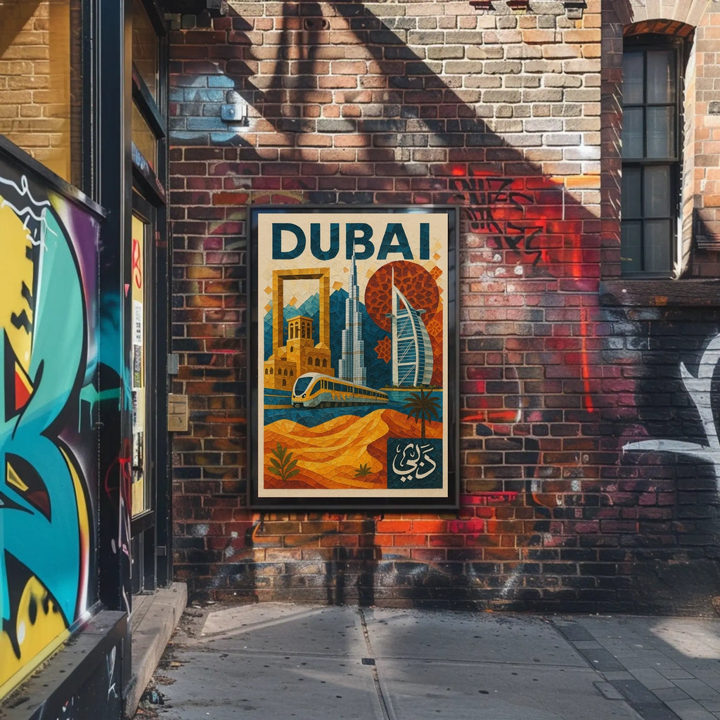 Travel-inspired storytelling — invites curiosity about Dubai’s evolution, turning a poster into a narrative focal point.