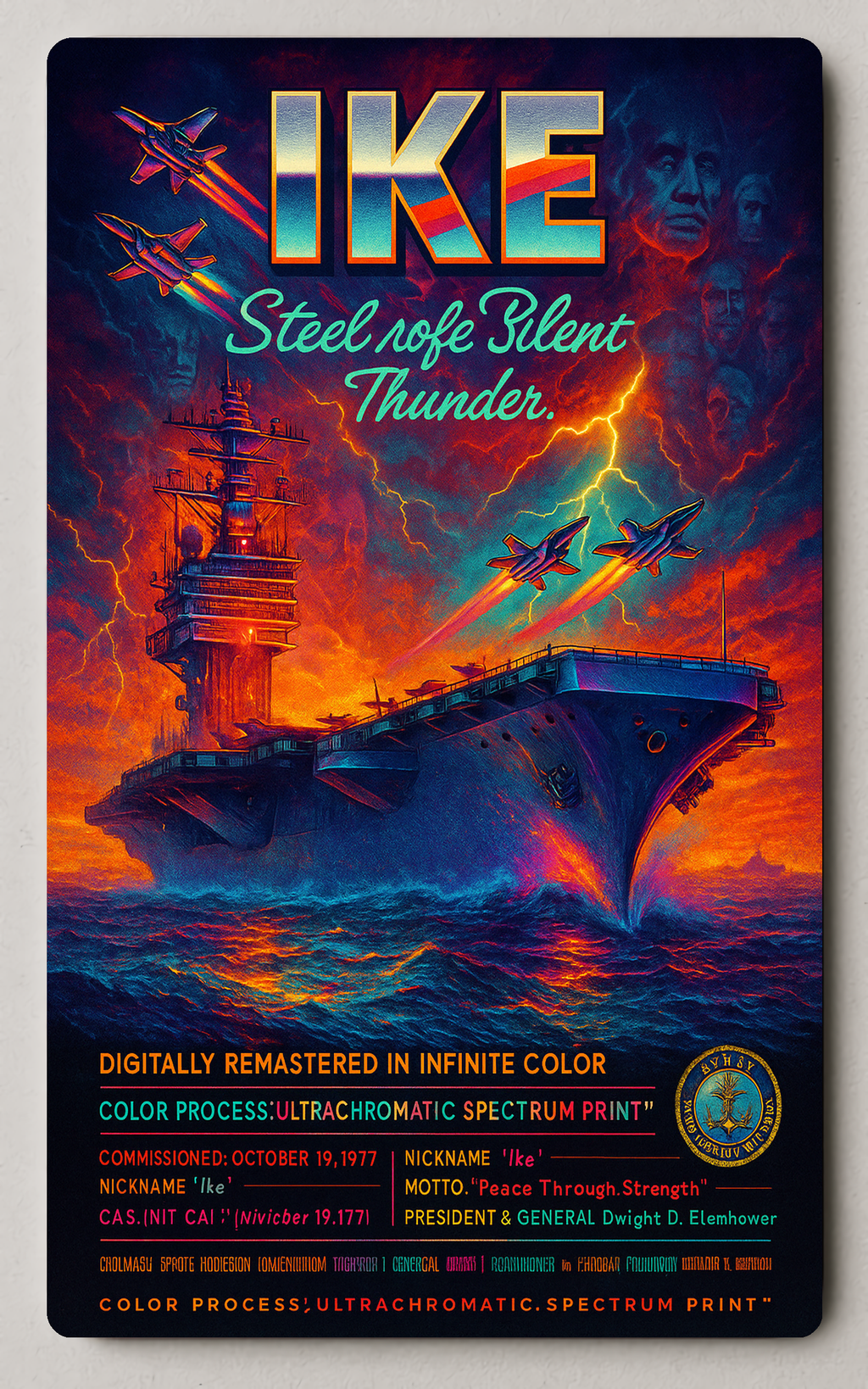 This high-impact piece features a bold "IKE" title, cinematic carrier and jet imagery, and atmospheric storm-cloud portraits that evoke leadership and military strength. Carefully remastered with a modern color process, the design balances nostalgic iconography and contemporary print quality for a dramatic visual statement.