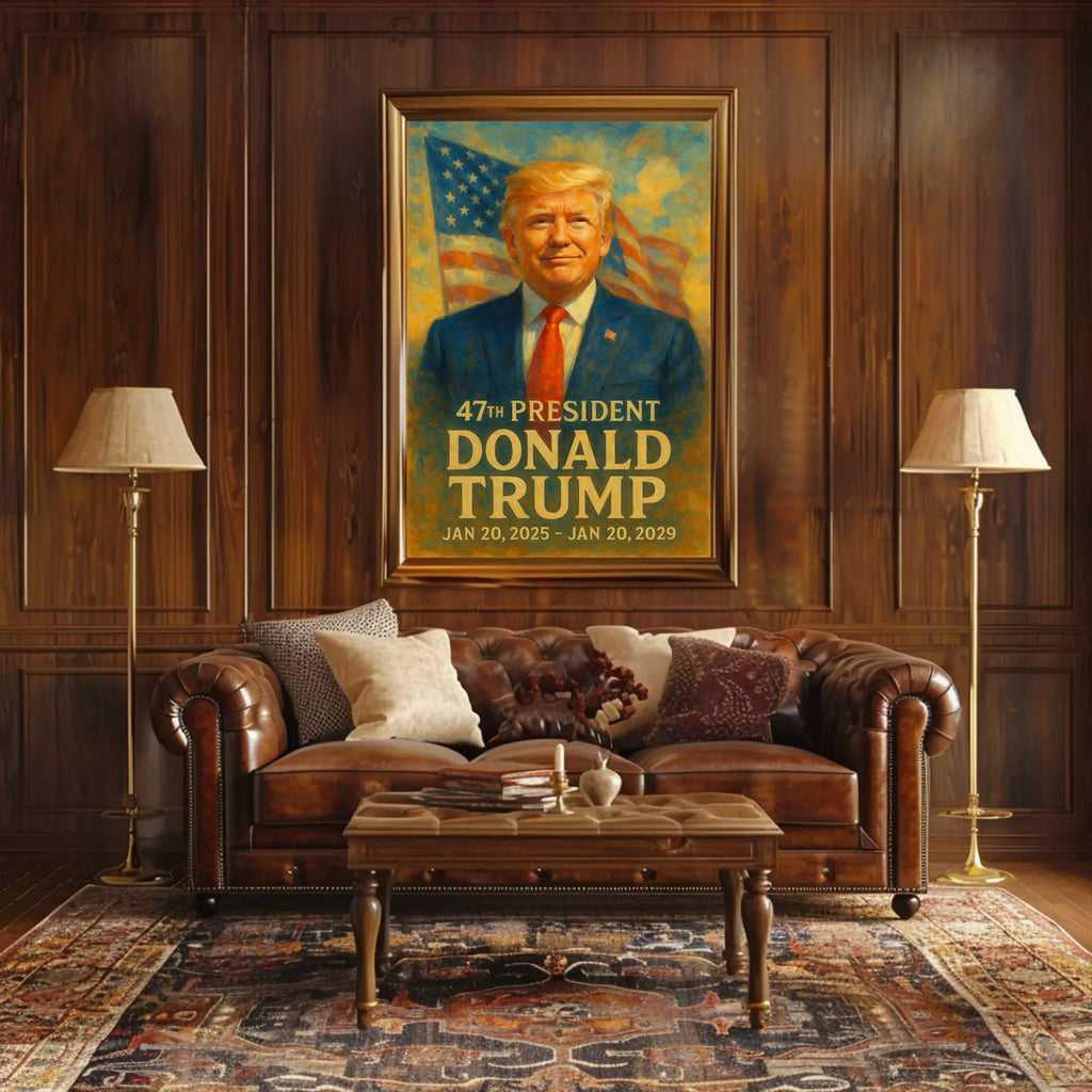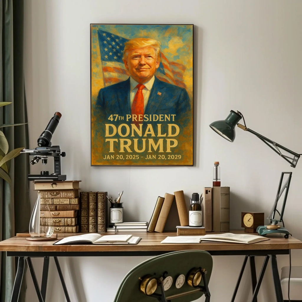 Celebrate the beauty of the Donald Trump Visionary Future Leader Poster with this timeless wall art. Designed to capture its unique appeal, this piece is perfect for collectors, enthusiasts, or anyone who wants to bring meaning and inspiration into their space. The artwork features Donald Trump gazing toward the horizon with an air of visionary determination, while the American flag waves majestically behind him, symbolizing unity and the promise of a brighter future. The poster proclaims him as the 47th President from 2025 to 2029, inviting viewers to imagine a future where resilience and courage lead the way.