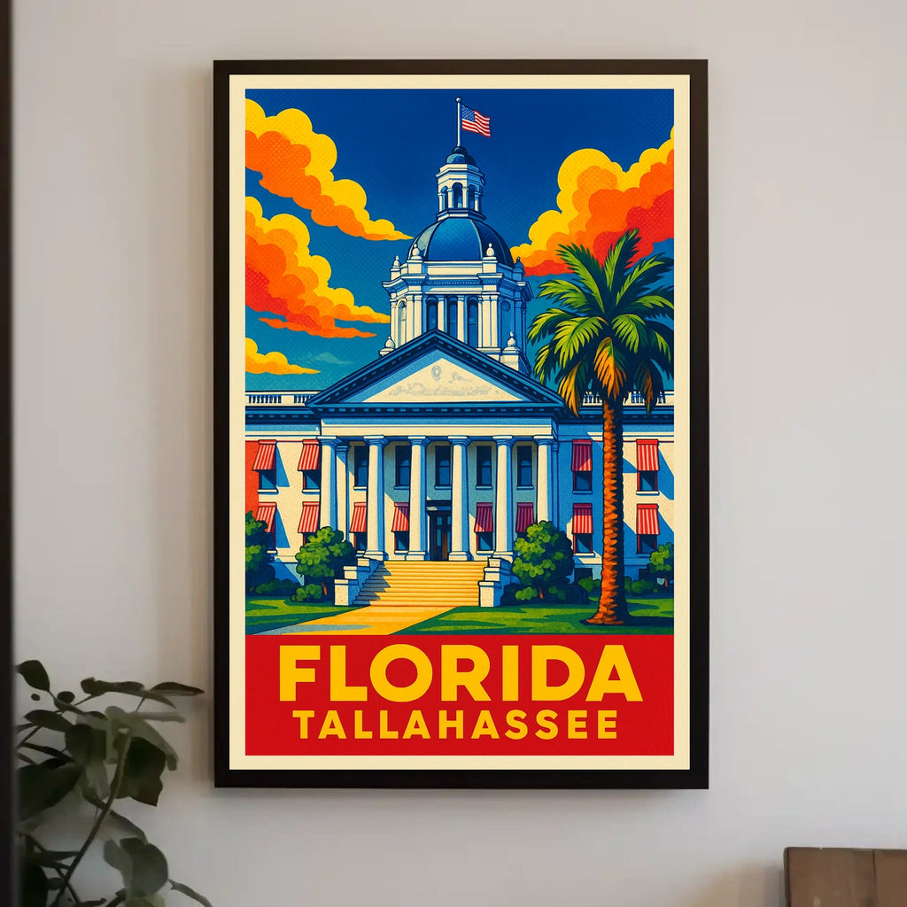Inspired by real-world scenery, this poster captures the essence of the Florida State Capitol in Tallahassee, blending architectural detail with wanderlust-inspired charm for any room.