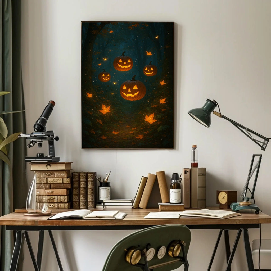 Celebrate the beauty of this whimsical Halloween travel poster, set in a dark, enchanted forest. The central focus is on several glowing jack-o'-lanterns with classic carved faces, seemingly floating amidst softly lit autumn leaves and a misty blue background. The artistic style is magical and mystical, with a slightly eerie, yet playful mood. Warm orange tones of the pumpkins and leaves contrast against the deep blue hues of the forest, creating a captivating and festive atmosphere.