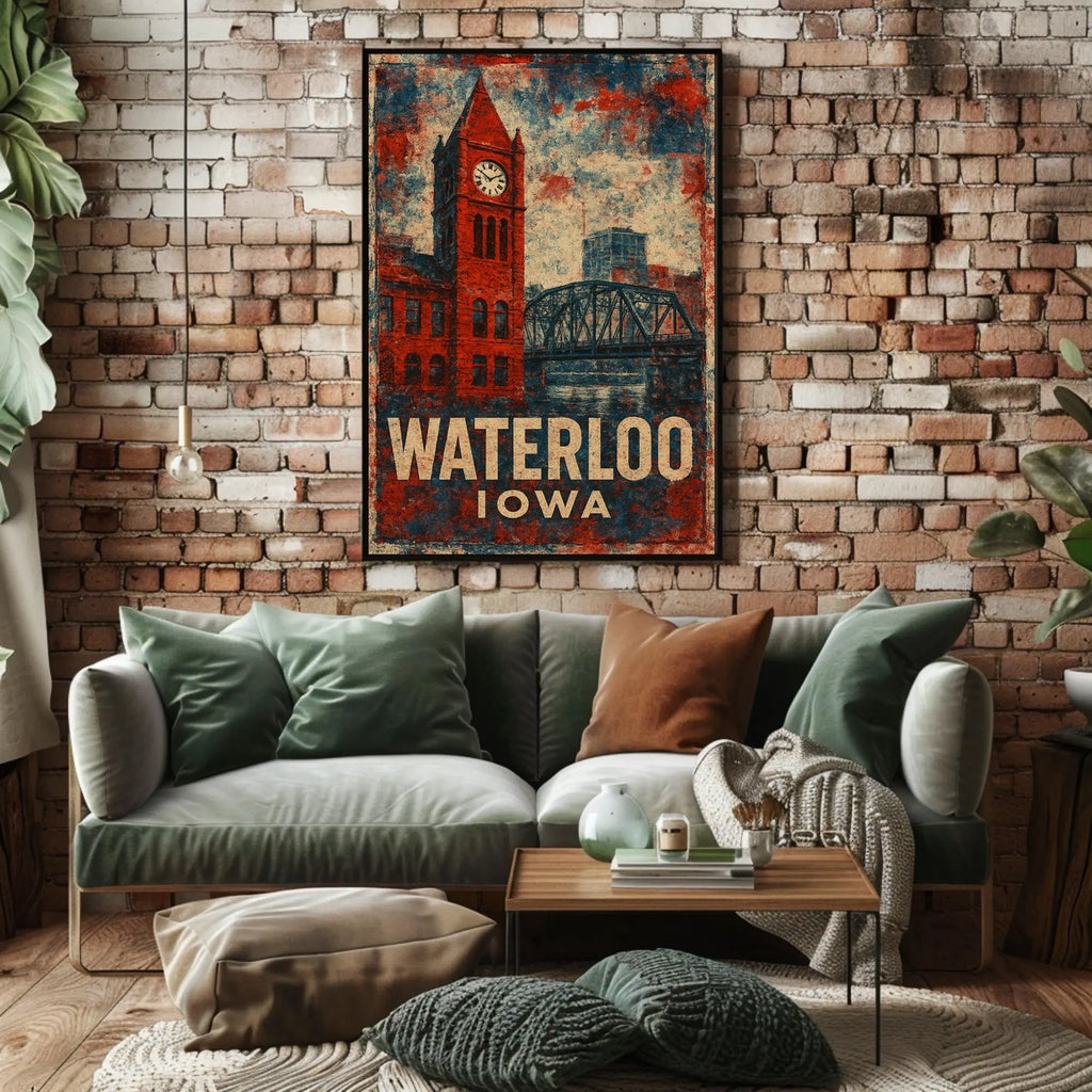Celebrate the rich history and architectural charm of Vintage Waterloo Clock Tower Poster: Americana Art Print with this timeless wall art. Featuring a striking red-brick clock tower and an iron bridge that hints at Waterloo, Iowa's industrial roots, this piece captures the unique appeal that attracts collectors, enthusiasts, or anyone who wants to bring meaning and inspiration into their space.