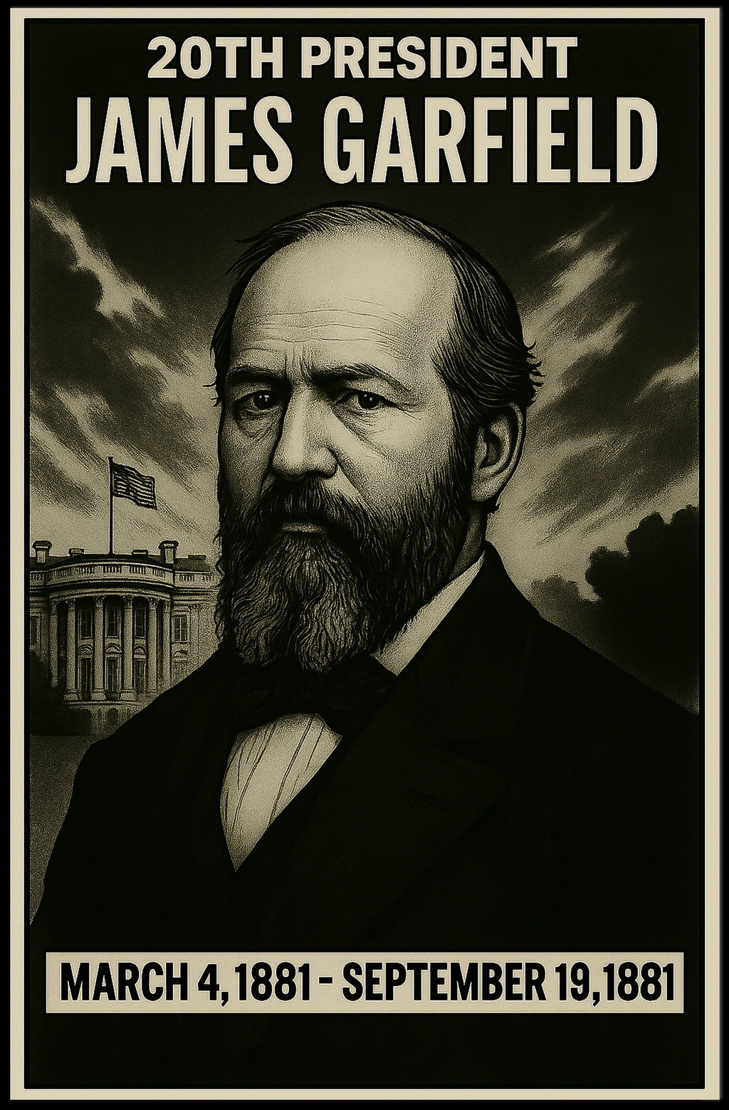 This poster captures the essence of Garfield and his era, blending a historic portrait with a scenic backdrop to create a piece that is both educational and inspiring.