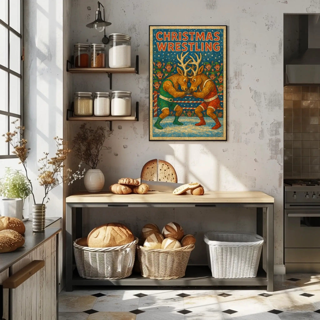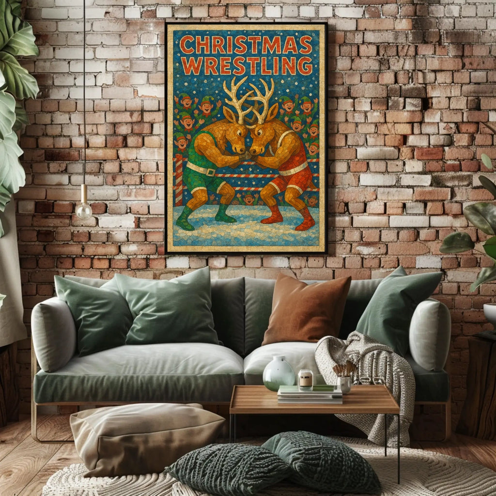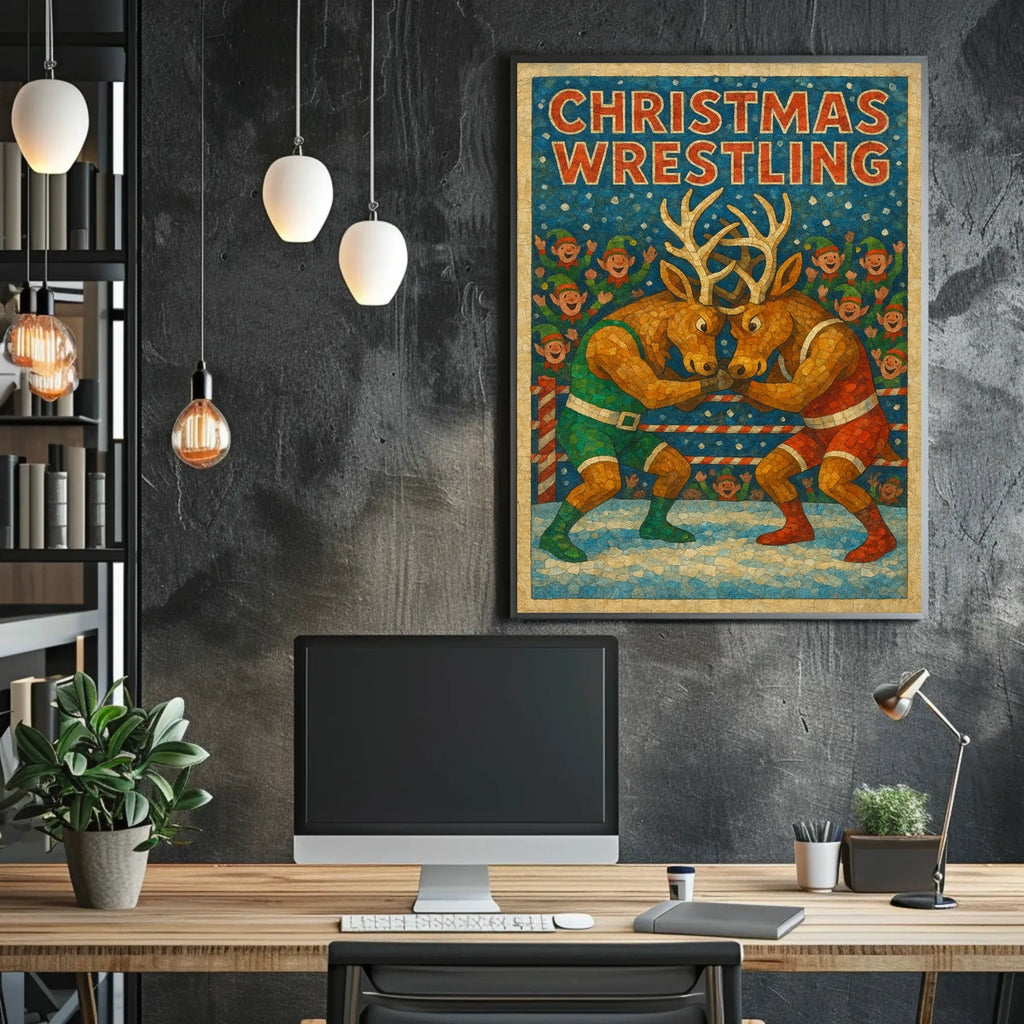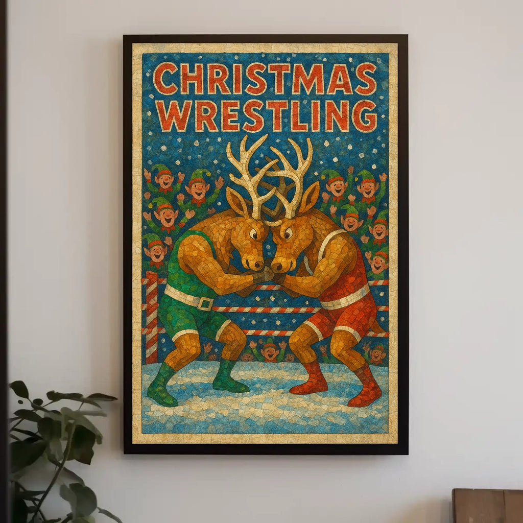 Celebrate the holiday season with this imaginative and festive "Christmas Wrestling" poster, showcasing a whimsical scene of two reindeer in a playful wrestling match. Dressed in vibrant green and red wrestling attire, these charming characters are set against a lively backdrop of cheering elves, capturing the spirit of celebration. The vintage mosaic-like texture and vibrant colors create a cheerful holiday atmosphere, enhanced by a snowy setting with gently falling snowflakes. Perfect for adding humor and creativity to your holiday decor, this unique poster appeals to those seeking a fun twist on traditional Christmas themes.