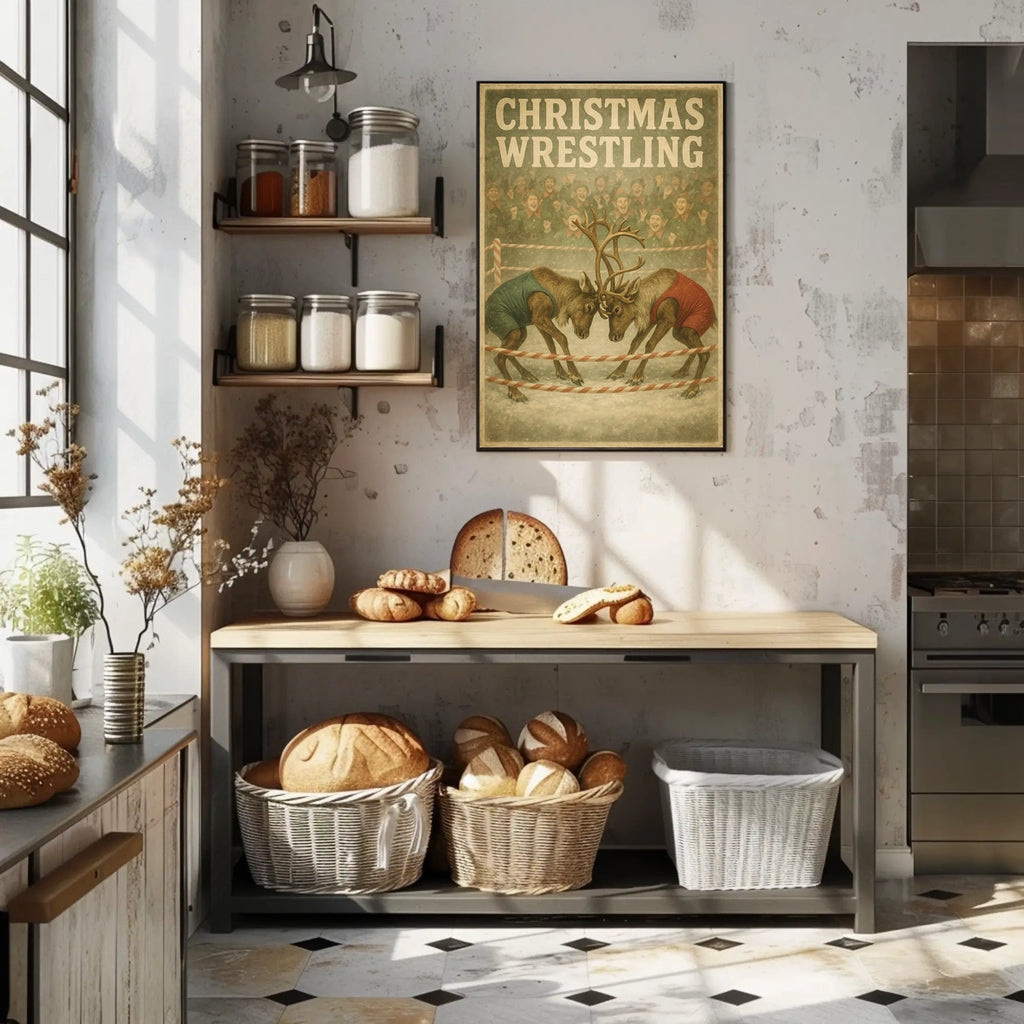Christmas Wrestling Reindeer Vintage Holiday Poster Print