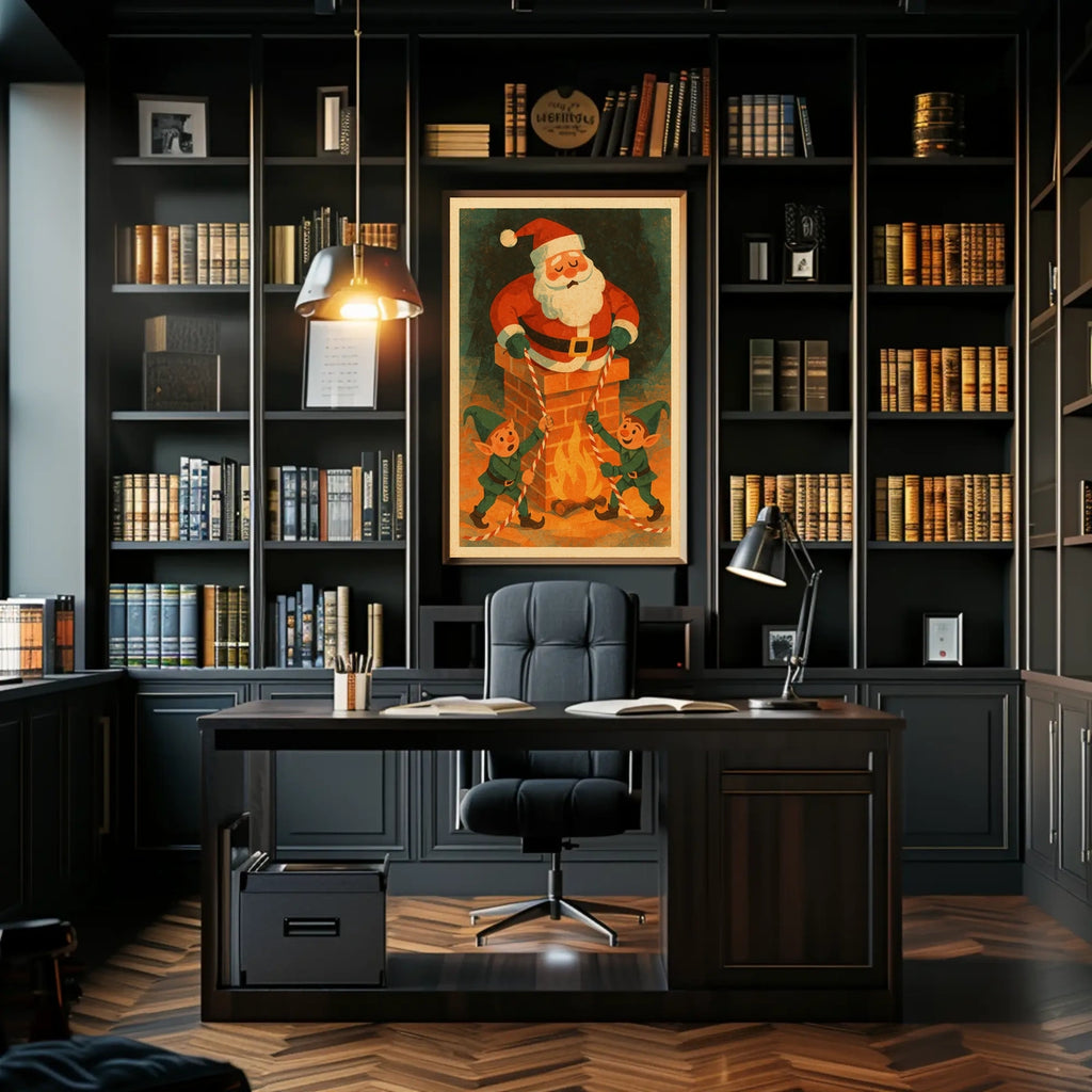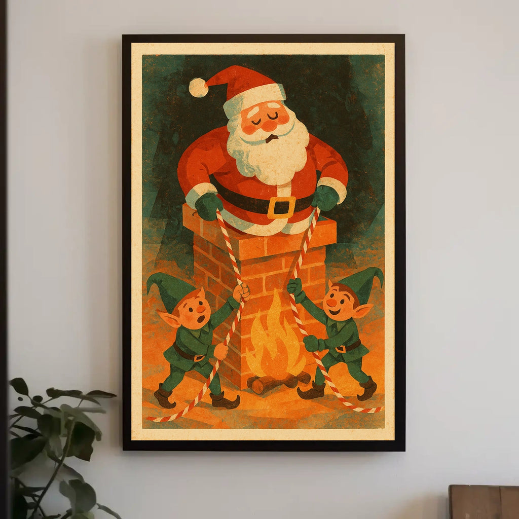 Transform your holiday decor with this delightful vintage Christmas poster, capturing a whimsical scene where Santa Claus finds himself humorously stuck in a chimney. Two cheerful elves lend a hand, using candy cane ropes to assist him, while a cozy fire flickers warmly at the base. The artwork boasts a mid-century retro vibe, characterized by bold colors and simple shapes, evoking a playful and nostalgic holiday spirit. Perfect for adding a touch of festive humor to your home, this poster is a charming reminder of the joy and laughter that the holiday season brings.
