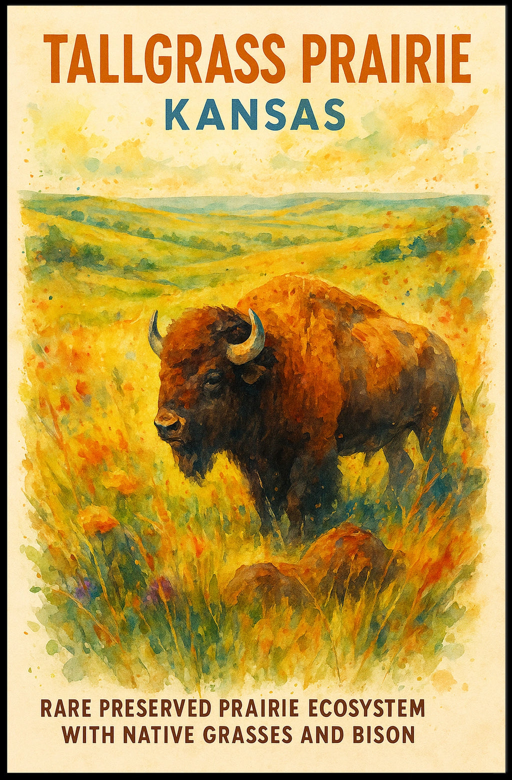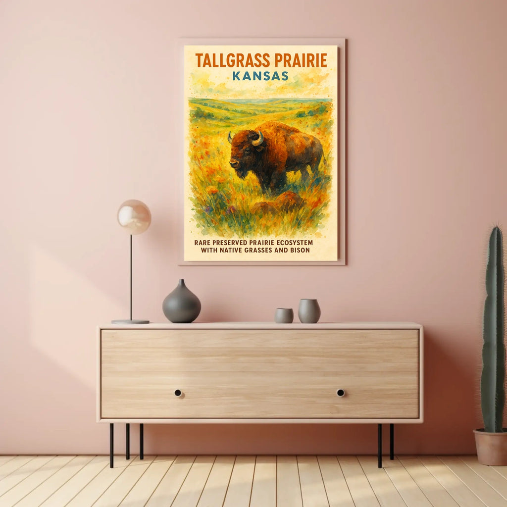 Immerse yourself in the serene beauty of the Kansas tallgrass prairie with the Kansas Prairie Bison Impressionist Art Poster. Featuring a majestic bison amidst lush fields of native grasses, this piece captures the essence of a rare and preserved prairie landscape. The painterly, impressionistic style uses soft, blended brushstrokes and warm earth tones to evoke a sense of peace and nostalgia. Perfect for nature enthusiasts and art lovers alike, this poster not only highlights the beauty of untouched ecosystems but also serves as a reminder of the importance of conservation. Bring the tranquility of the prairie into your space today.