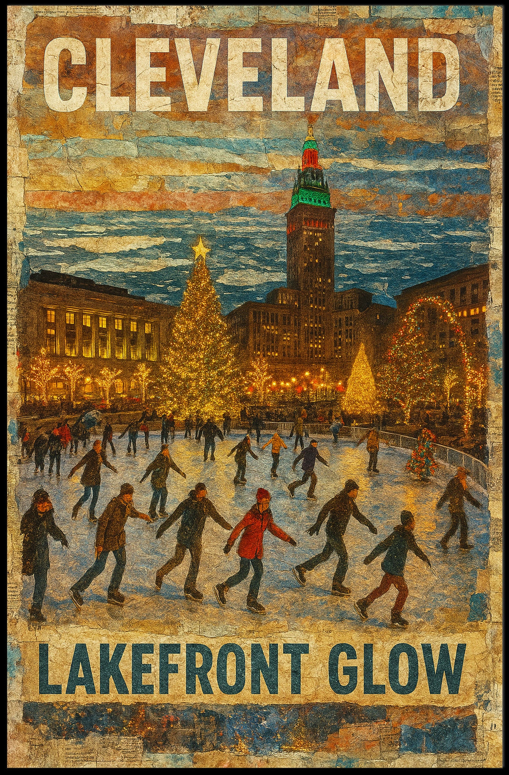 - Detailed design highlighting Cleveland's lakefront glow and waterfront scenery