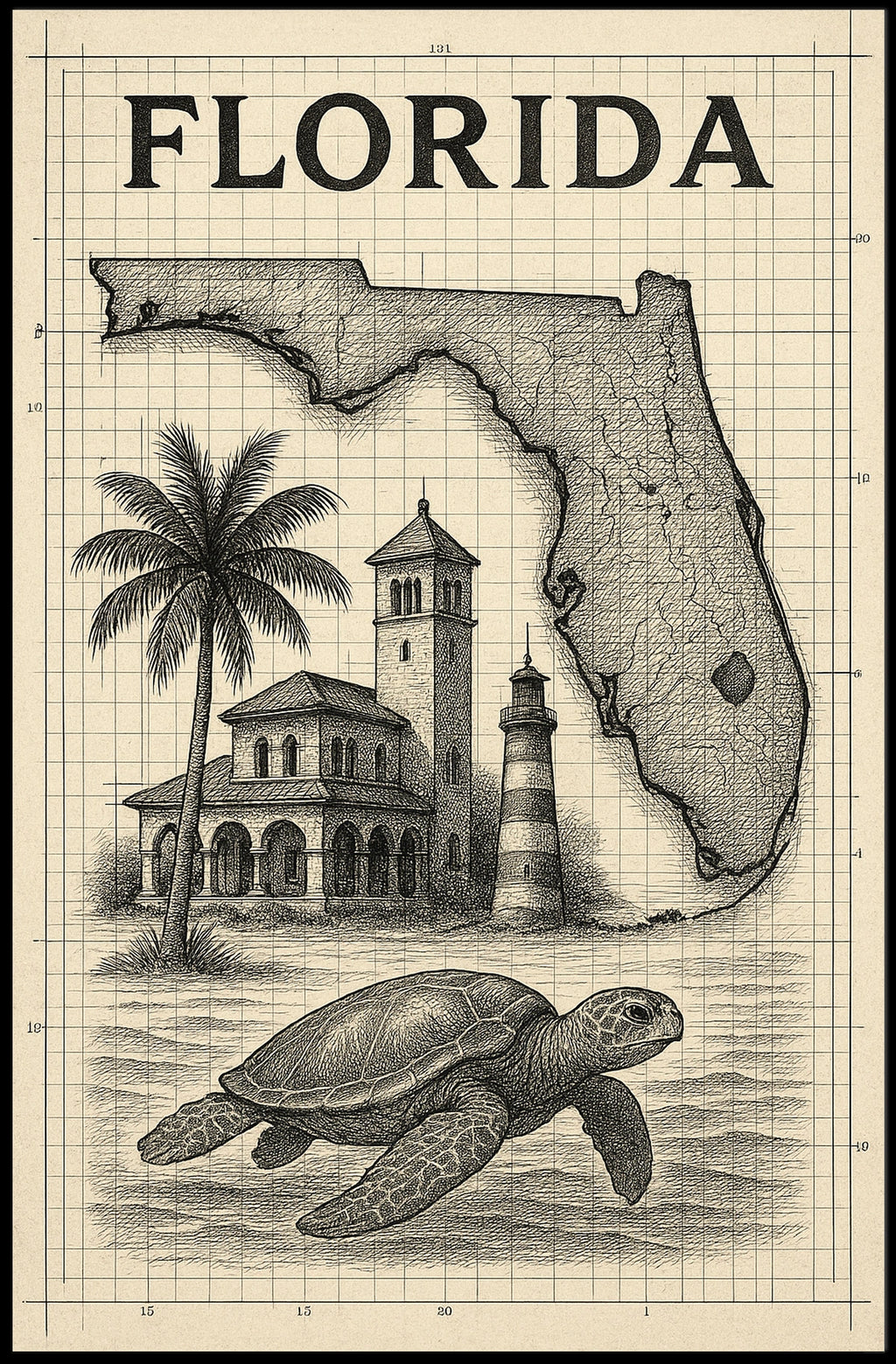 Detailed design highlighting Florida's iconic landmarks and native wildlife