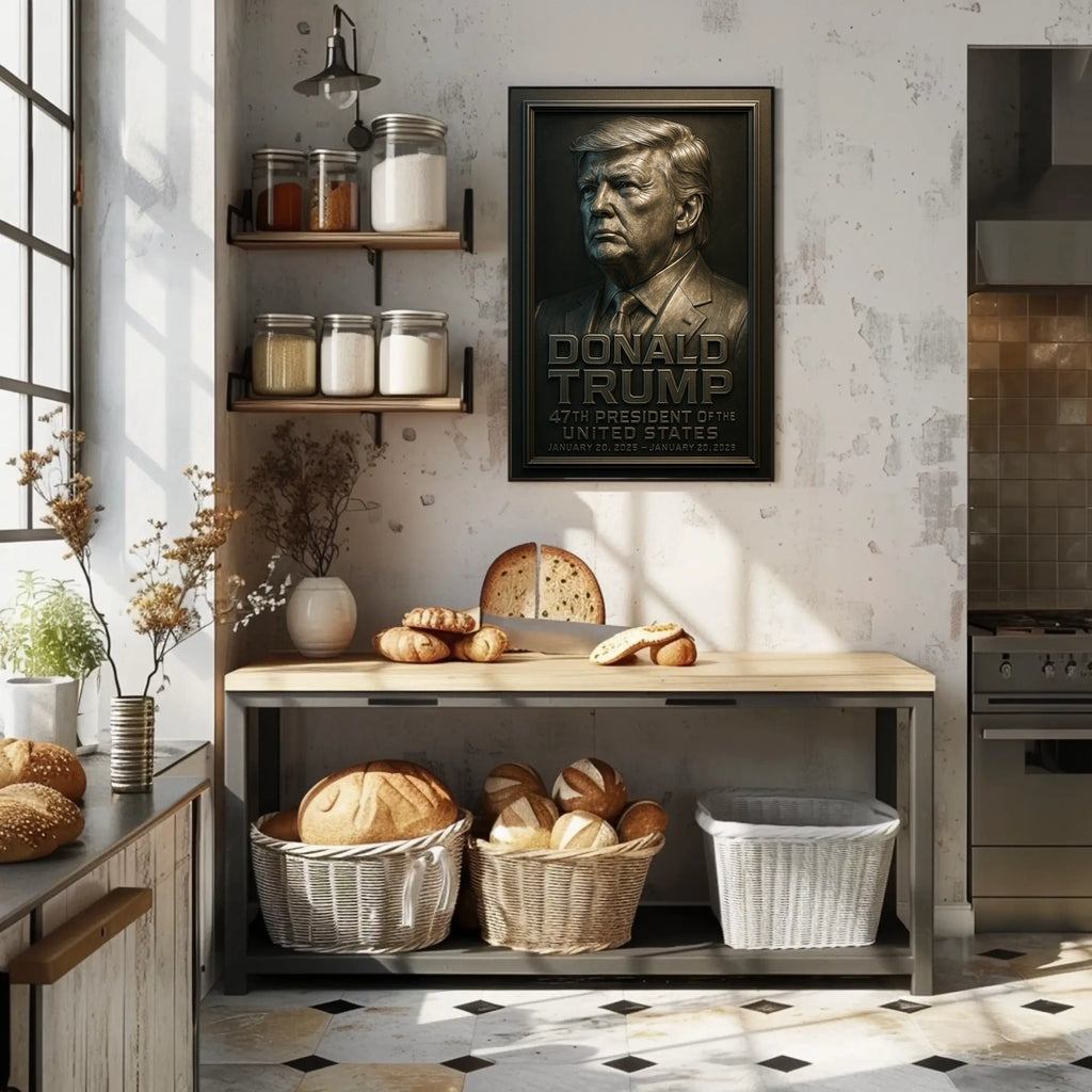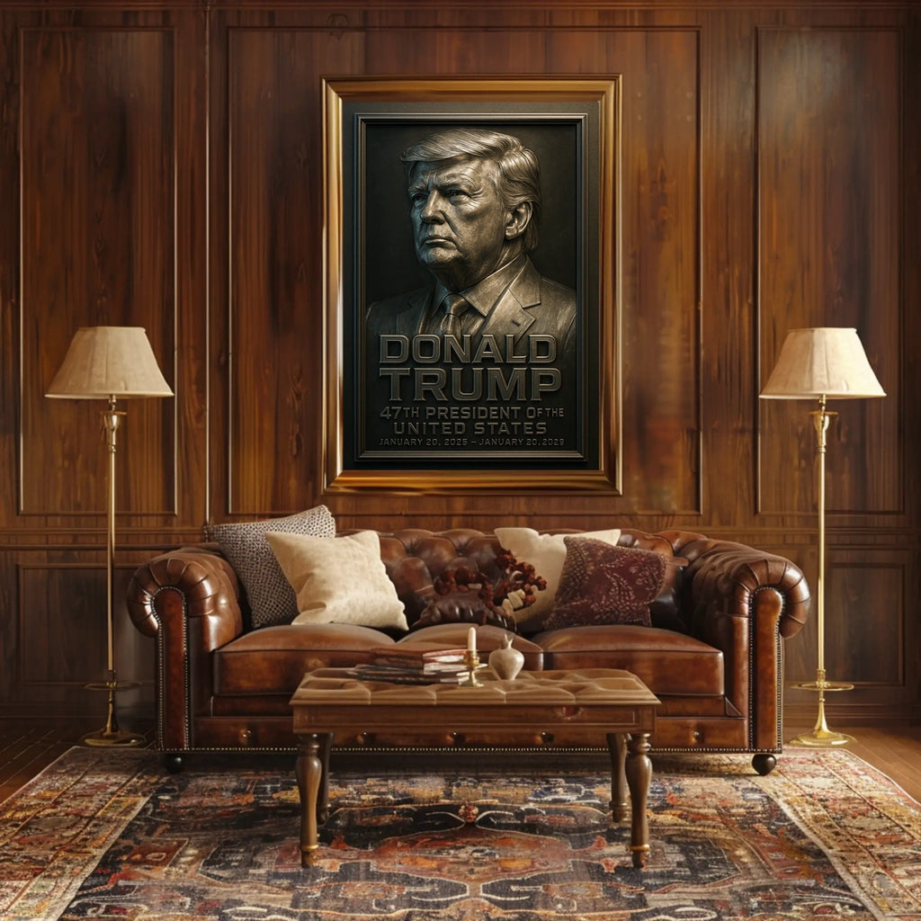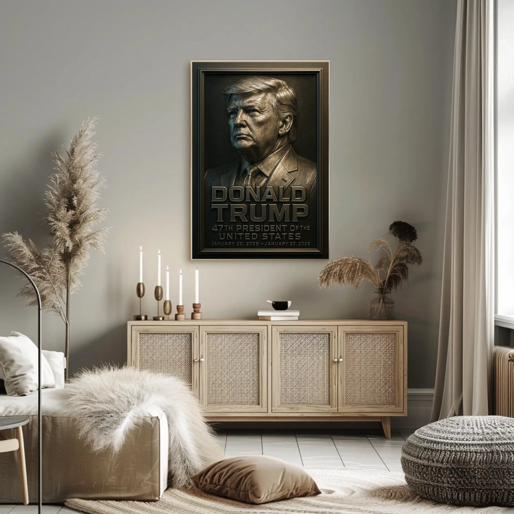 Celebrate the legacy of leadership with the Donald Trump Legacy of Honor Poster. Dive into a moment of historical gravitas with this exquisite art piece, portraying Donald Trump in a classic, momentous pose. Cast in a bronze relief, the emphasis on his chiseled features encapsulates the essence of authority and leadership. The backdrop, intentionally minimalistic, serves to amplify the iconic presence of the former President, underscoring a timeless sense of dignity and respect. This collectible art print is not merely a decoration but a testament to Trump's enduring influence and the storied period of his presidency, making it an essential piece for supporters and history enthusiasts alike.