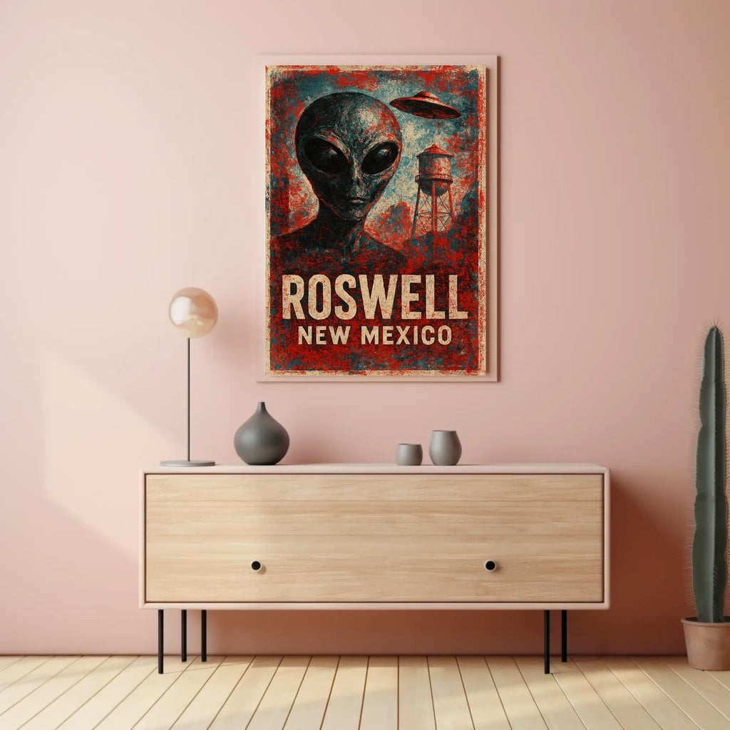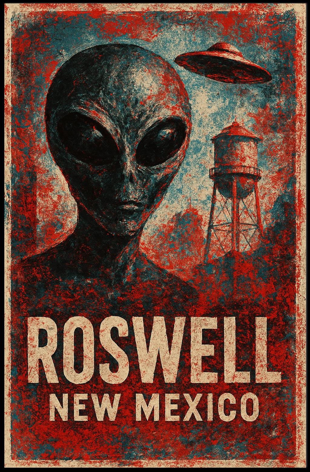 Celebrate the mystery of Roswell with the Roswell UFO Sci-Fi Vintage Extraterrestrial Futuristic Sci-Fi Poster—a captivating wall art piece designed for collectors, enthusiasts, and anyone drawn to the unknown.
