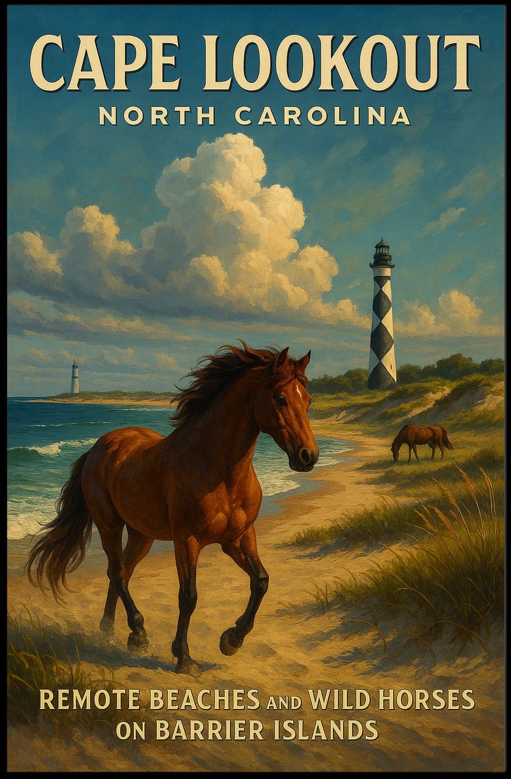 Celebrate the beauty of Cape Lookout North Carolina with this timeless wall art—a coastal travel decor piece for home and beach lovers. Designed to capture its unique coastal charm, this poster adds charm to any room and invites a sense of wanderlust and inspiration into your space.