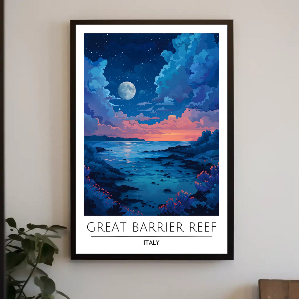 Bring the magic of a moonlit shoreline into your home with the "Dreamy Coastal Night Scene Under Full Moon" artistic poster from PosterGoat. This digital illustration captures a tranquil coastal landscape reminiscent of the Great Barrier Reef — a calm, reflective sea framed by rocky outcrops and coral-like vegetation beneath a star-studded sky and radiant full moon. Rich blues and warm sunset pinks combine to create a surreal, dreamy atmosphere that transforms any room into a peaceful retreat.