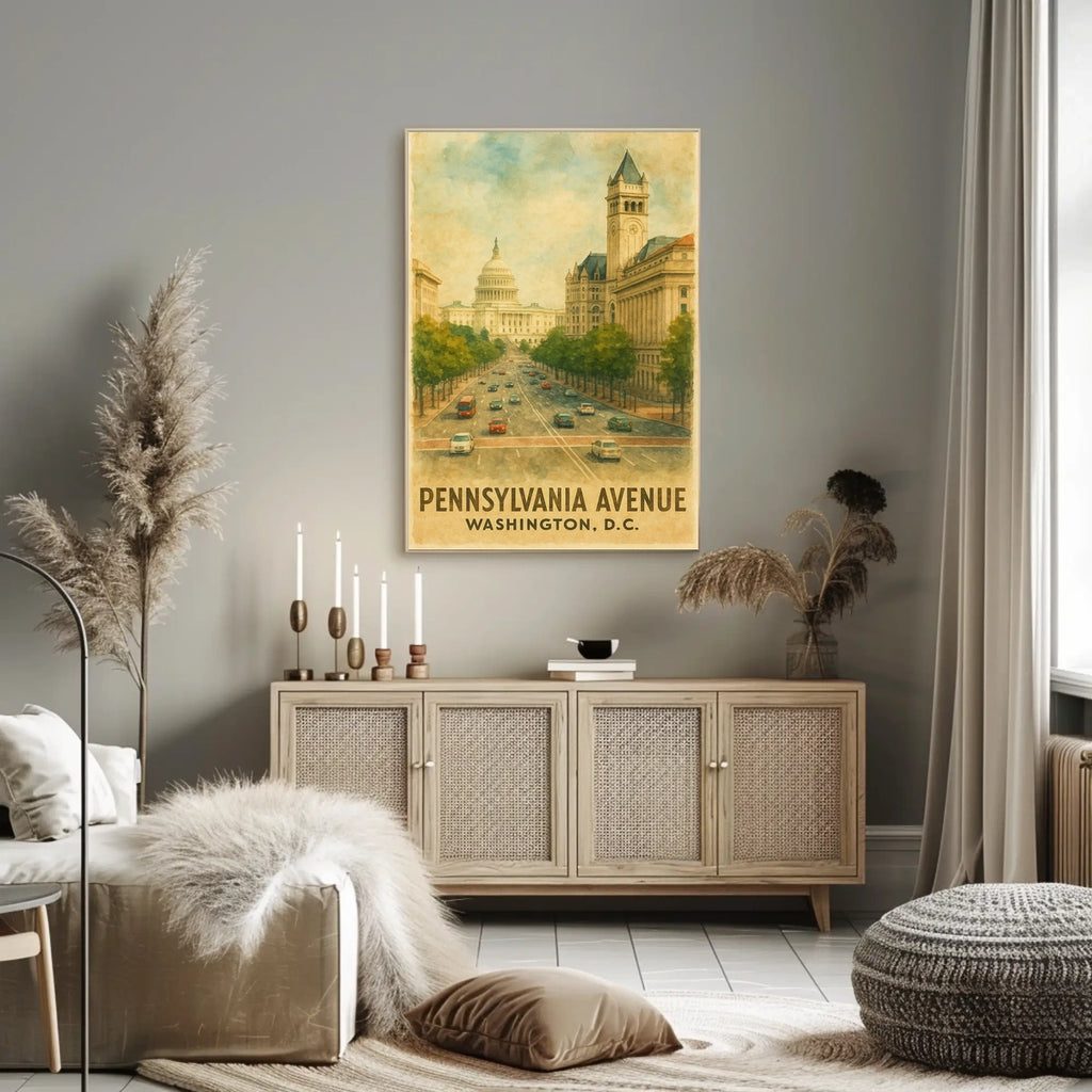 This poster captures the essence of Pennsylvania Avenue Washington, D.C. with visuals inspired by real-world scenery, adding charm to any room for decor lovers and wanderlust spirits alike.
