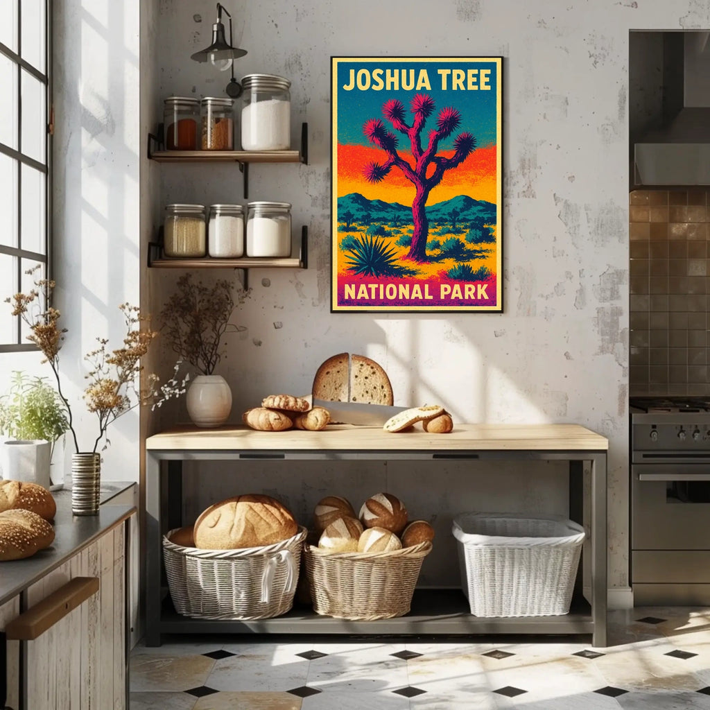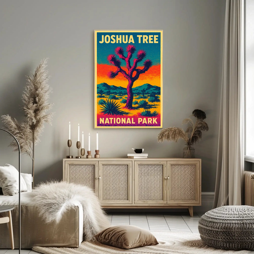 Immerse your walls in the enchanting allure of the American Southwest with a poster that highlights a majestic Joshua tree, its spiky branches reaching out against a vibrant desert backdrop. The scene explodes with bold, contrasting colors—deep blues, fiery oranges, and pinks—evoking the magic of a desert sunset. Crafted in a vintage style with a modern twist, this artwork exudes an adventurous and bold mood, perfect for travelers, nature lovers, and retro art enthusiasts.