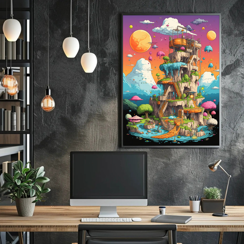 Step into an imaginative world with the Whimsical Tower in Dreamland Futuristic Sci-Fi Poster. This captivating piece of art blends a fantastical landscape with whimsical steampunk elements, making it an extraordinary addition to any decor. Featuring a towering, multi-level structure that seamlessly merges with nature, this poster invites you on an adventure through a dreamlike realm. With vibrant colors and cartoonish forms, it evokes a sense of playfulness and wonder, perfect for art enthusiasts who appreciate creativity that sparks the imagination. The intricate details of platforms, staircases, and machinery suggest a harmonious balance between nature and technology, setting it apart as a unique piece in the home decor category.