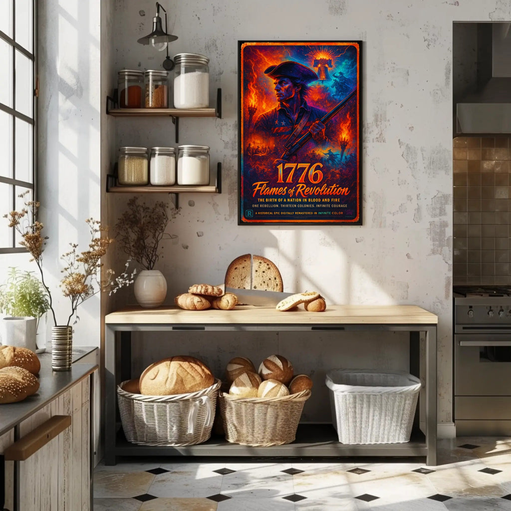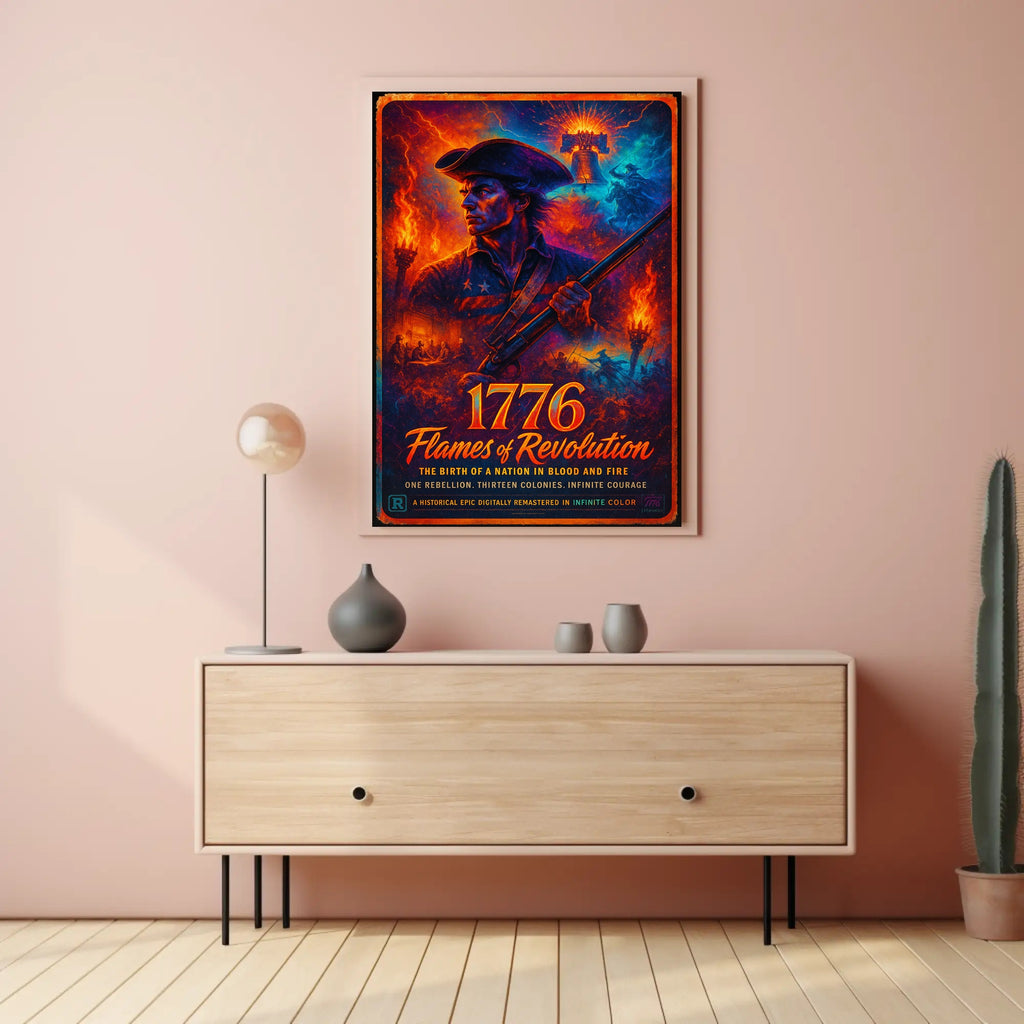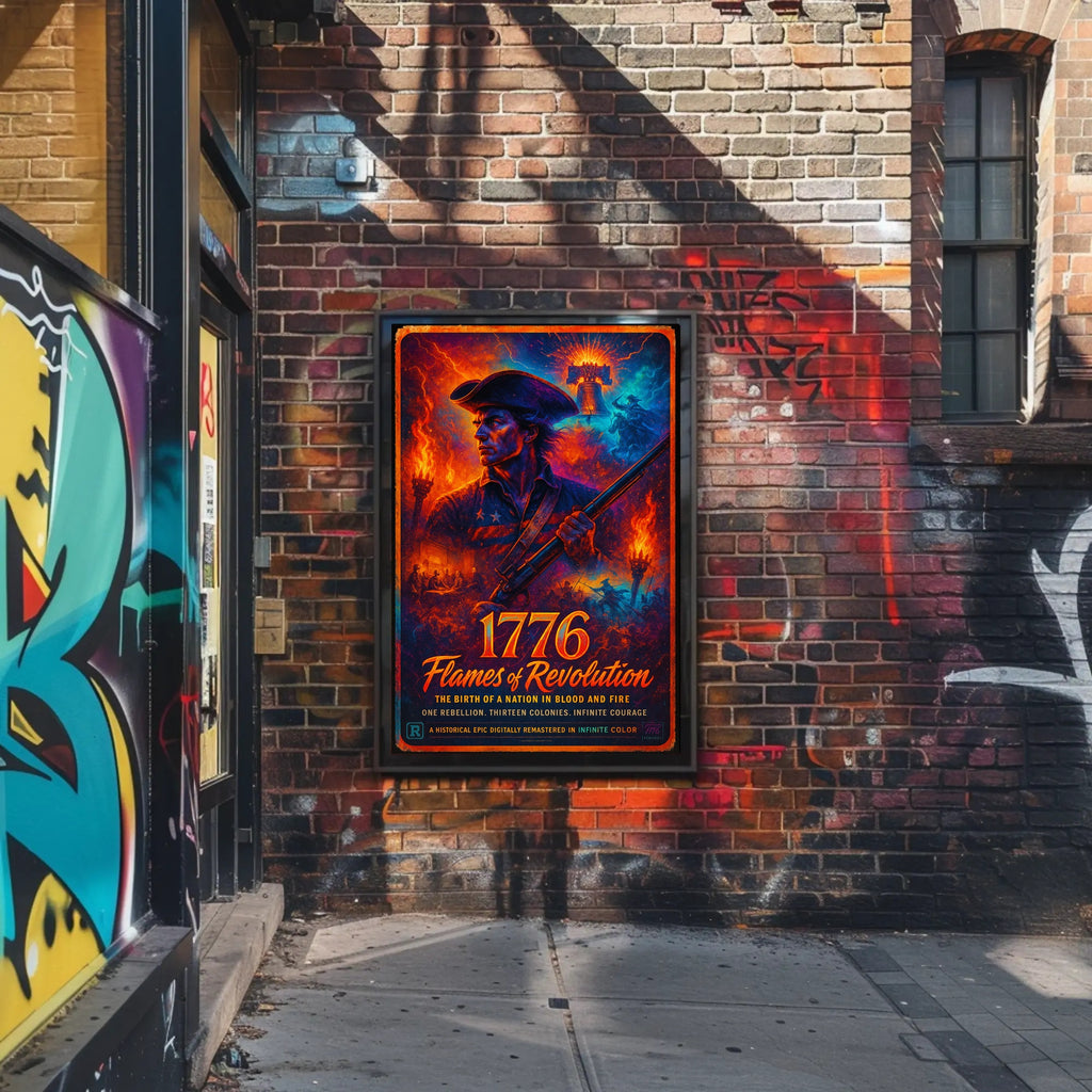 Bring a stirring moment of American history to your walls with the 1776 Rebellion and Independence Historical or Presidential Poster from PosterGoat. This cinematic poster captures a resolute patriot gripping a musket against a backdrop of erupting color — blazing torches, a luminous Liberty Bell, and ghostly cavalry rising through dramatic clouds — all rendered in digitally enhanced, pop-art style for a modern, vintage-meets-epic look.