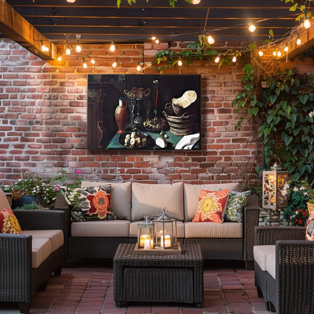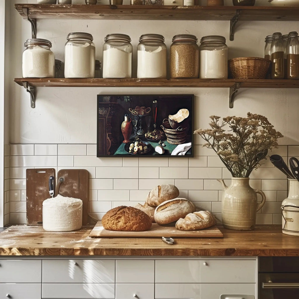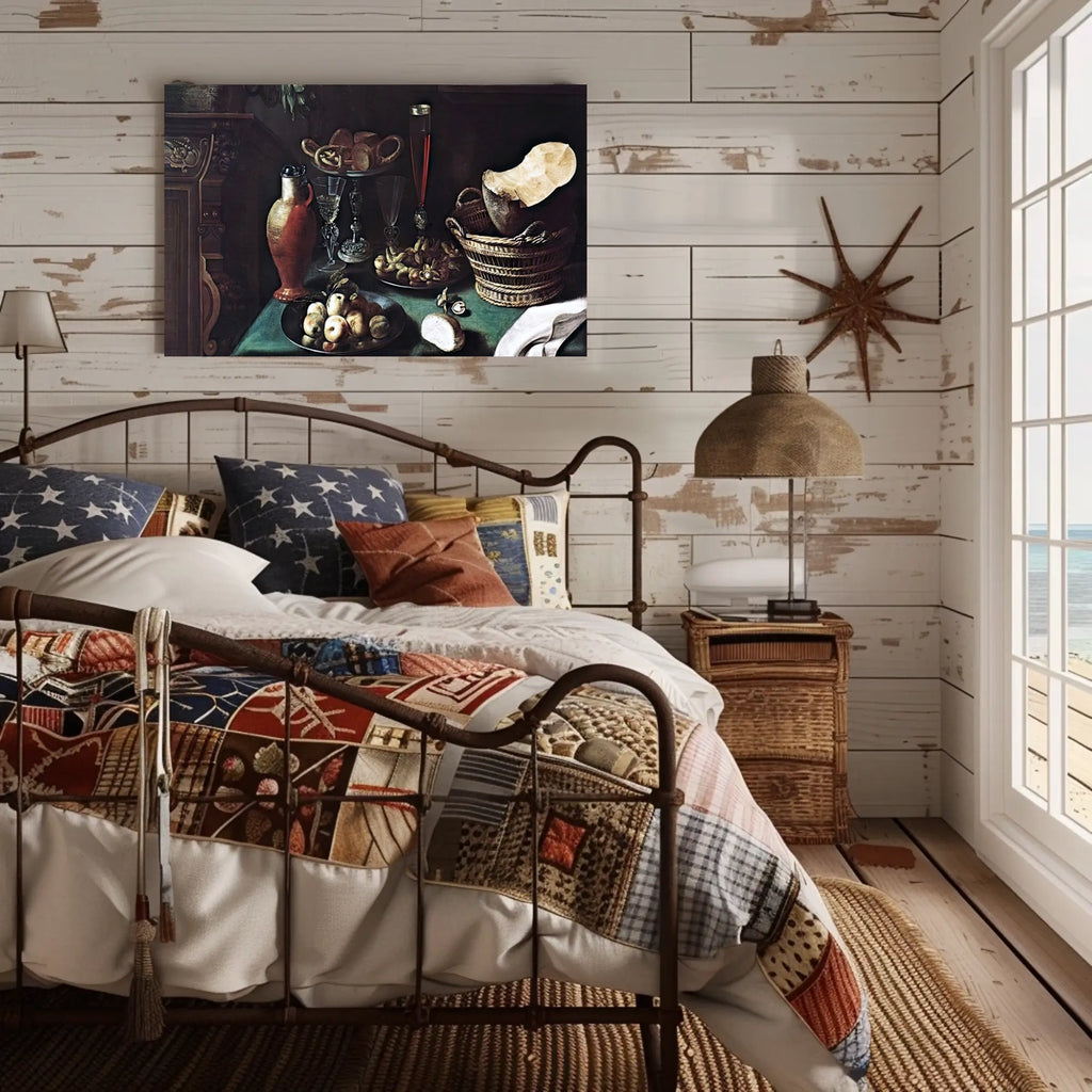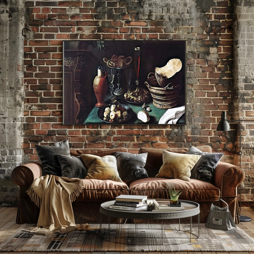 This exquisite poster captures the essence of 17th-century Dutch still life art, drawing viewers into a richly detailed scene that celebrates abundance. Central elements like a rustic ceramic jug, ornate silver goblets, and a selection of fruits and bread showcase the photorealistic style's commitment to realism and meticulous detail. The backdrop of intricate wood paneling adds a touch of opulence, while the deep, muted colors emphasize contrasting textures, creating a timeless, historical atmosphere. Ideal for art lovers, this piece invites viewers to appreciate the luxurious and prosperous domestic life of the era.