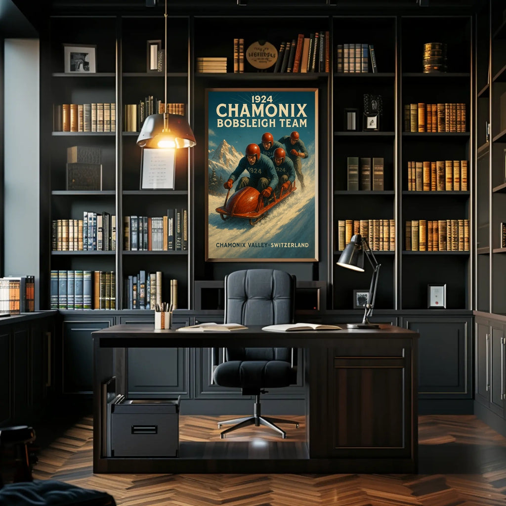 Transport your walls to the snowy lanes of 1924 Chamonix with this Bobsleigh Team poster. Designed for decor lovers and wanderlust spirits, it blends historical charm with modern aesthetics, making any space feel adventurous.