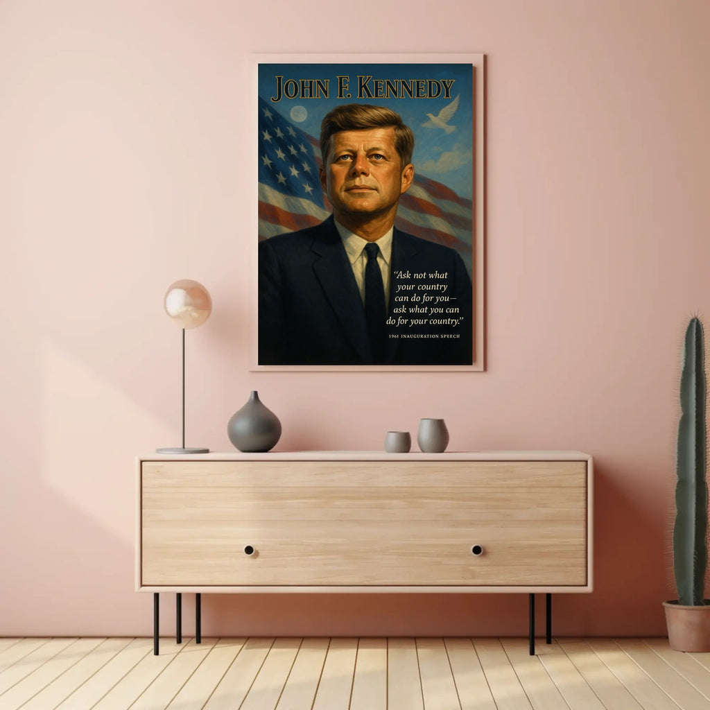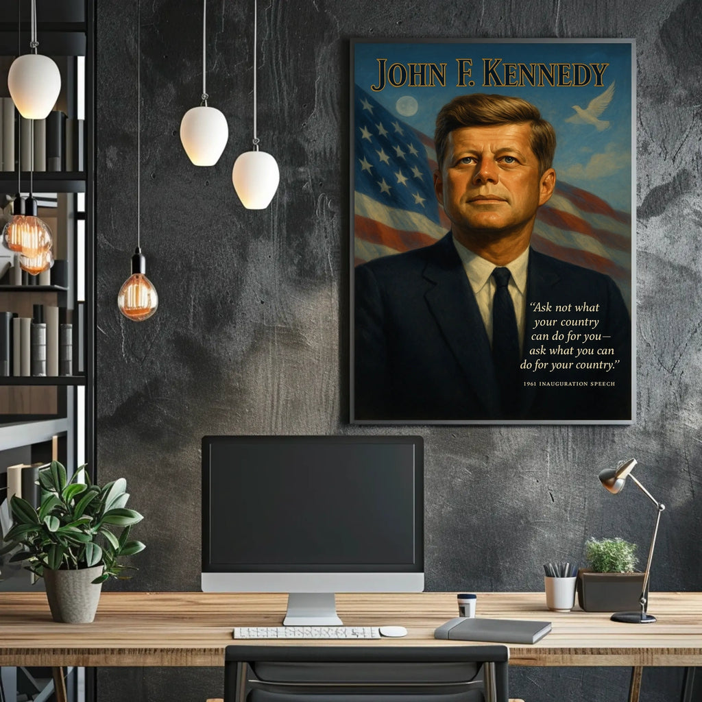 The 1960s Patriotic Poster: Inauguration, Peace, and Pride is a striking vintage-style depiction that captures a pivotal moment in American history. This photorealistic poster centers on a historic figure during the 1961 inauguration, set against an American flag backdrop with the moon and a white dove symbolizing peace.