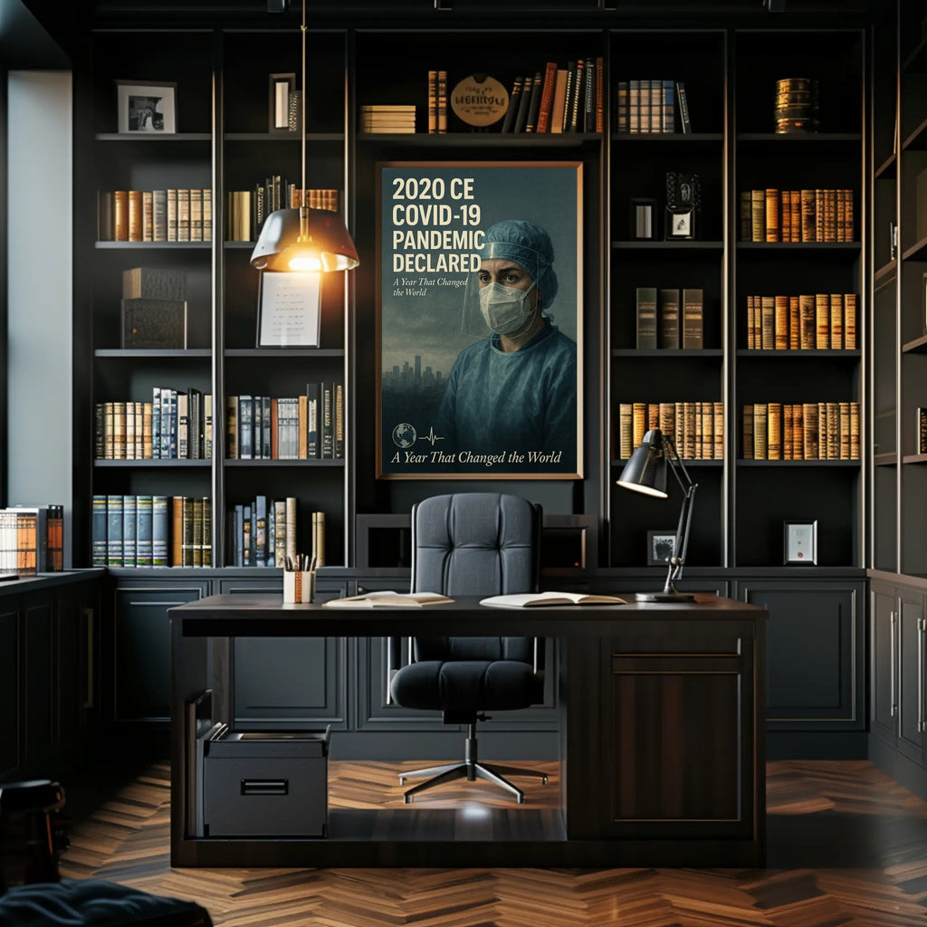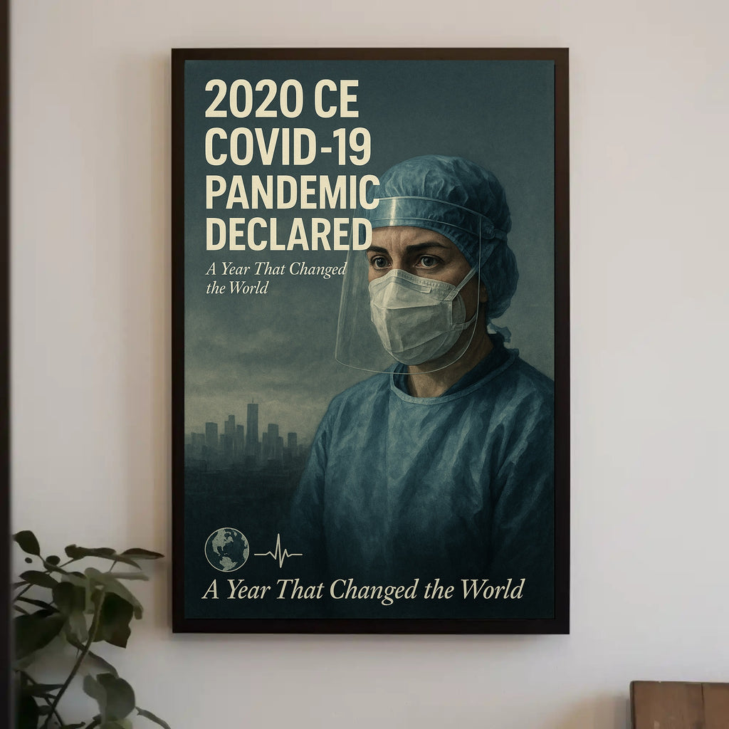 COVID-19 Pandemic Declared Poster Art Print for 2020 CE — a moving, minimalist poster from PosterGoat that captures the gravity and resilience of a year that changed the world.